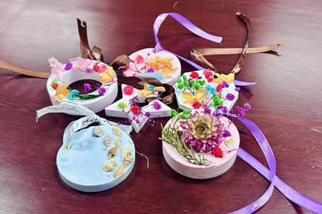 在校区老师的指导下,女教职工们纷纷动手制作干花精油香薰石膏。选材、调配精油、搅拌石膏、倒入模具……每一个步骤都充满了乐趣与惊喜。姐妹们互相交流、互相帮助,现场洋溢着欢声笑语。经过一番精心制作,一块块造型独特、香气四溢的香薰石膏逐渐成型。随后脱模、加装缎带、制作包装……大家手持自己的作品,脸上洋溢着满满的成就感。活动接近尾声时,大家意犹未尽,仍然收集着剩余的石膏和材料,浇筑成新的作品。