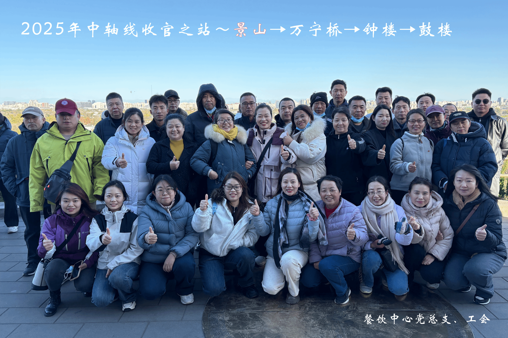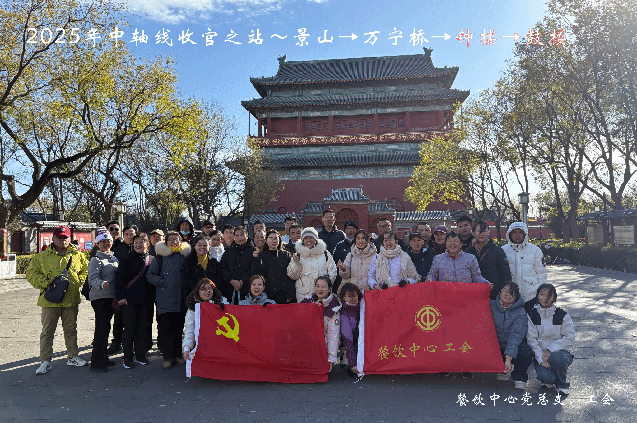 为深入贯彻落实习近平总书记关于传承中华优秀传统文化的重要指示精神,深化党史学习教育,11月16日,餐饮中心党总支及工会组织开展“中轴行系列活动”终篇——景山公园、万宁桥与钟鼓楼研学活动。作为连续三年深耕中轴文化传承的收官之作,本次活动以“登中轴之巅,听历史回响”为主题,通过实地探访北京中轴线北段核心景观,系统梳理中轴线历史脉络,为系列活动画下圆满句点。