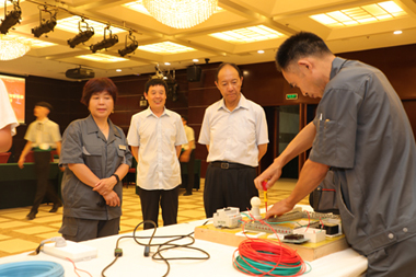 由于比赛项目及参赛人员较多,大赛根据项目特点灵活安排比赛时间及场地,30个项目分别在群英宴会厅主赛场及6个分赛场依次举行。各类比赛时间及场地安排的紧密有序,赛场气氛热烈浓厚。主会场上分区同时进行着几场比赛。宴会服务员两人一组利落美观地布好“回字”场型;销售经理与留学生展开情景模拟对话;工程信息室、强电、水暖等各班组员工熟练地调试、拆解、组装各类设备;客房前台接待亲切解答客人提问;宿舍庶务员在为员工办理入住手续、讲解注意事项;厨师们也奉上独居匠心的珍馐菜肴。与此同时,各分会场比赛也如火如荼地进行,首次尝试的直播系统及时将分会场比赛实况传递至主会场,不落下每一分精彩。8号楼南侧保安员迅速完成灭火扑救;9号楼库房即将进行采供知识问答;新园生活+收银员们正熟练地回答问题;花工师傅们也即将开始进行拆装各类绿化工具;5号楼员工餐厅厨师们烹调出色香味诱人的菜肴;和园主题餐厅收银台收银员快速准确为客人结账;70205会议室文员、职员奋笔疾书公文写作;4号楼康乐各区域开始技能业务比赛。