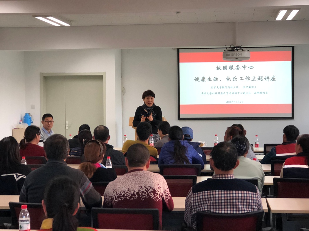 2018年11月9日下午,校园服务中心在43楼517会议室举办了“健康生活、快乐工作”主题讲座活动。活动由北京大学心理健康教育与咨询中心副主任庄明科博士、北京大学医院内科主任李卫菊博士主讲。中心80余名员工参加活动。活动由校园服务中心副主任兼工会主席陈贵兵主持。