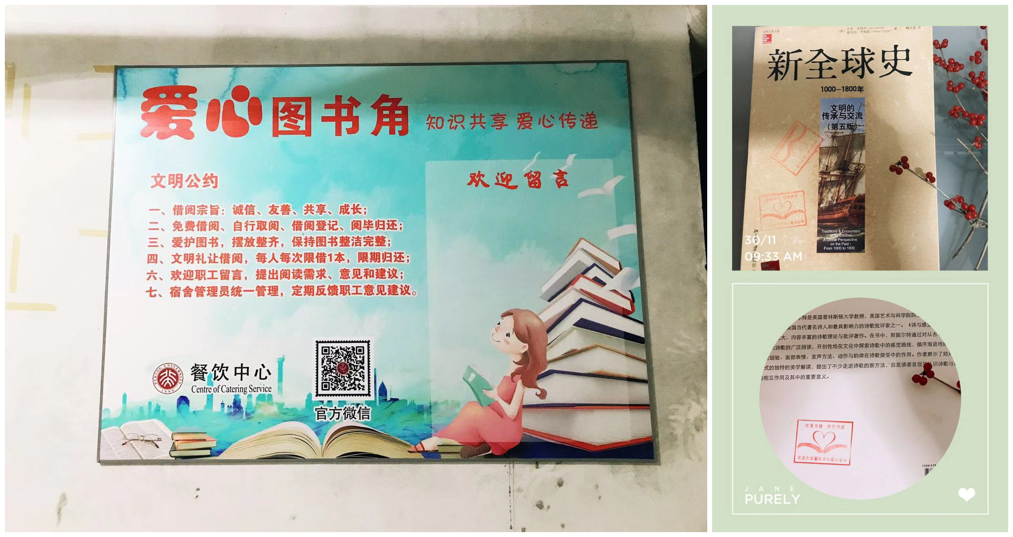 11月8日,餐饮中心工会发出“冬日,我拿什么来温暖你”的爱心捐赠图书的倡议,得到学校师生的积极响应。目前,已接受来自北京大学出版社和师生个人捐赠图书近千册。为此,餐饮中心专门购置了书架放在宿舍楼公共区域,免费供员工借阅,向员工传递爱与知识的力量。欢迎校内有意向的单位或个人继续参与捐赠。捐赠地点:43楼三层电梯门口捐赠箱。非常感谢!