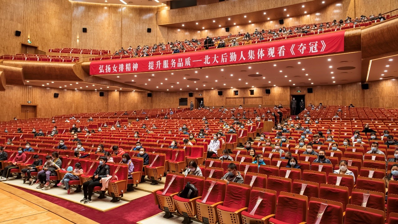 吃完长寿面,大家在温柔的夜色中走向百周年纪念讲堂。一进讲堂东门,一眼就能看见门口大屏幕上的“弘扬女排精神 提升服务品质——北大后勤人集体观看《夺冠》”字样。大家纷纷在屏幕前留影,让女排精神激励自己:过完生日,继续奋战在后勤服务一线!