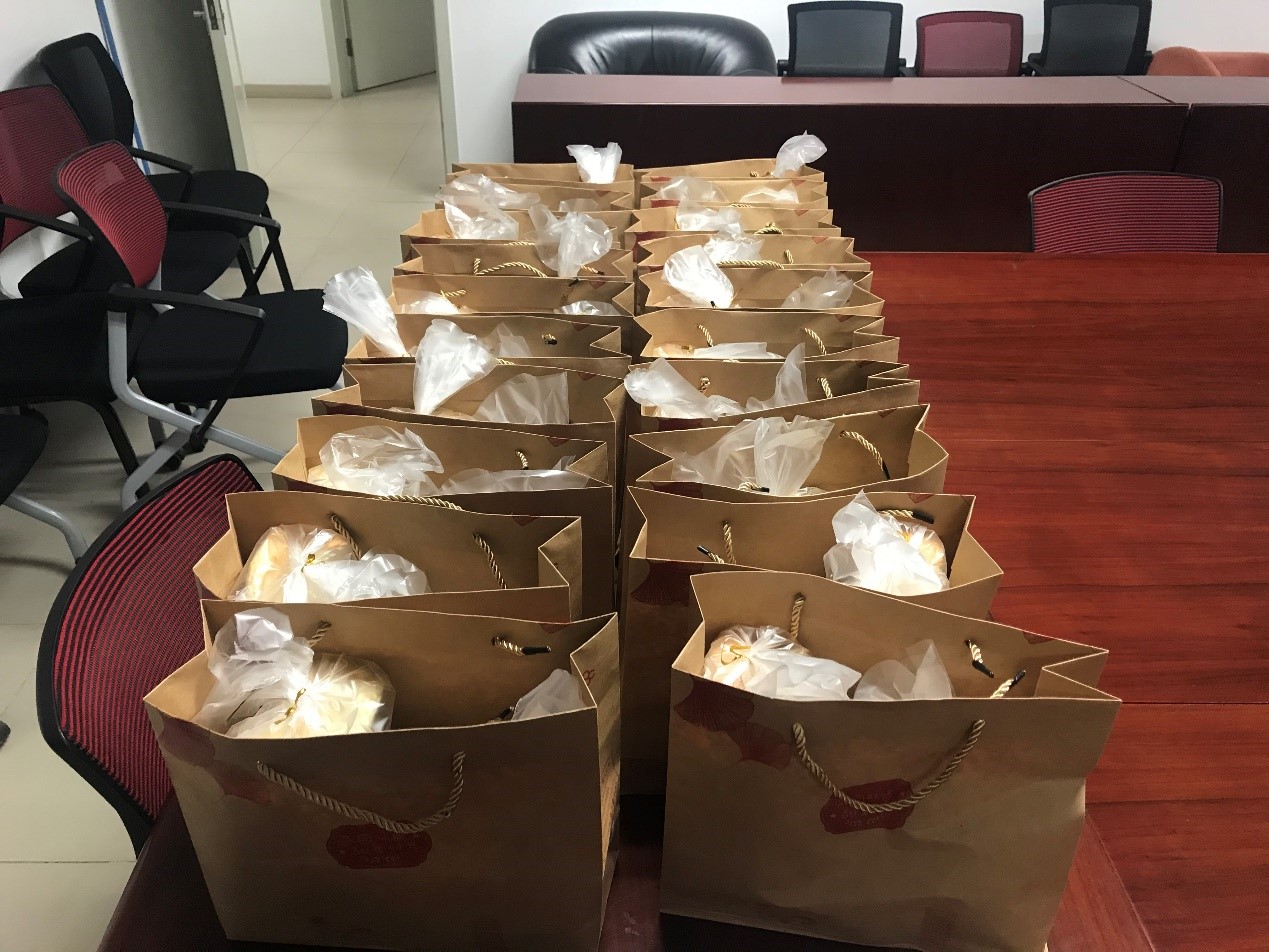10月21日、10月28日、11月3日,后勤系统2300余名1月—10月过生日的员工,分三批次收到了一份“生日大礼包”,礼包里装的是:一盒绿豆饼、一瓶手指饼干、一个椰蓉面包、一个香椰提子面包、一个紫薯面包和一袋蛋奶吐司。黄灿灿的面包、饼干搭配写有“燕园味道 甜蜜时光”的包装,让人看着就食指大动。