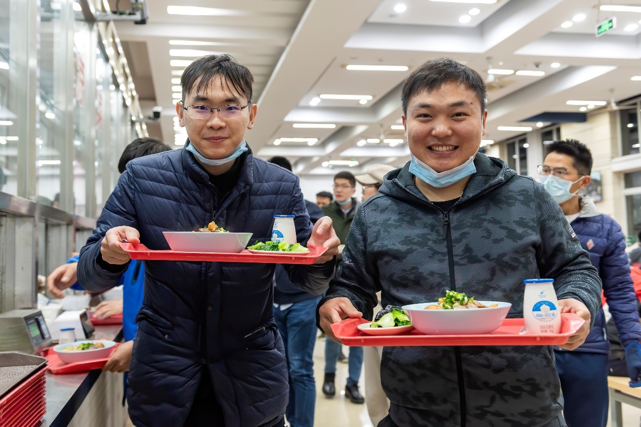 晚上6时10分,大家离开家园食堂走进学一食堂排队吃长寿面,每个人脸上都洋溢着热情的笑容,还有人踮起脚尖,期待地遥望打面的小小窗口。人多队长,一位在动力中心工作了16年的阿姨排在队尾,看着前面长龙一样的队伍,开心地说:“不着急,好饭不怕晚!”