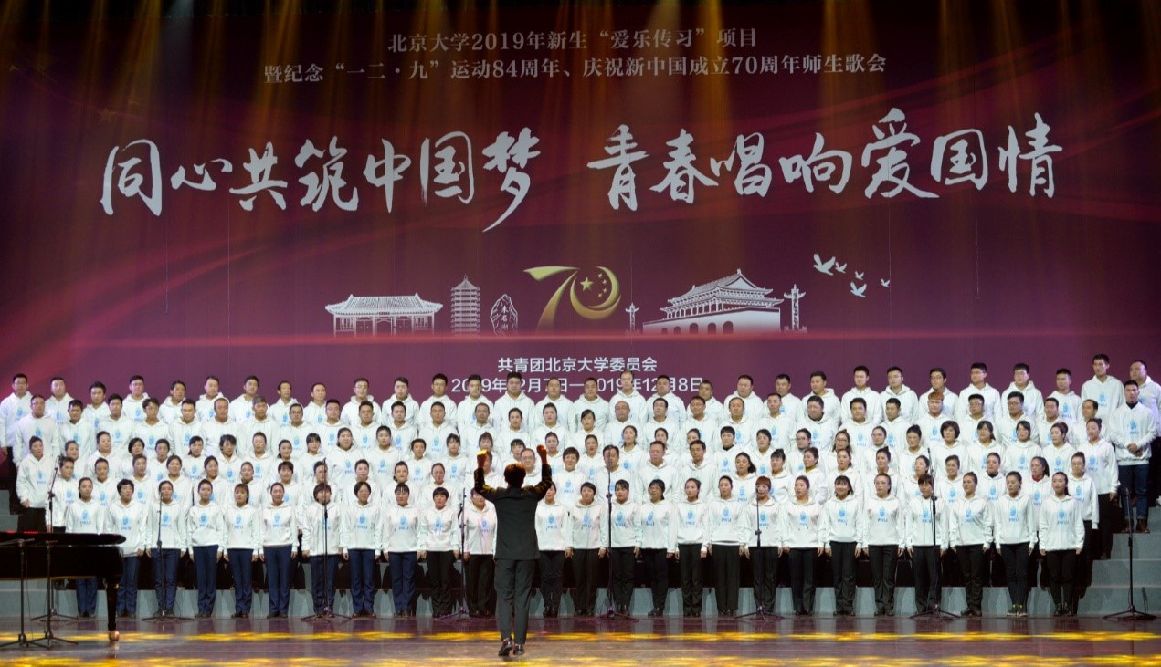 2019年12月7日—8日,北京大学2019年新生“爱乐传习”项目纪念“一二·九”运动84周年、庆祝新中国成立70周年师生歌会纪念“一二·九”运动84周年、庆祝新中国成立70周年师生歌会在百周年纪念讲堂隆重举行。在各支参演队伍中,身着一袭白色帽衫、胸前印着天蓝色节水节能LOGO的后勤系统合唱队格外引人注目。他们带来了原创歌曲《为共和国比心》,以真挚的情感,唱出了北大后勤人热爱祖国、为祖国奉献终生的永恒誓言。