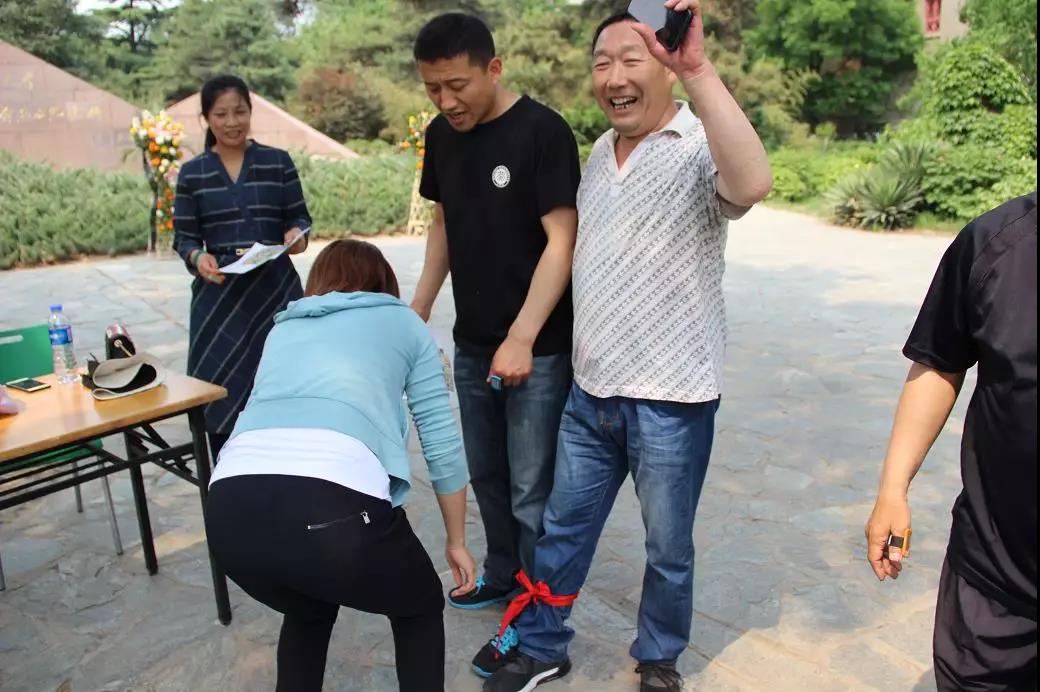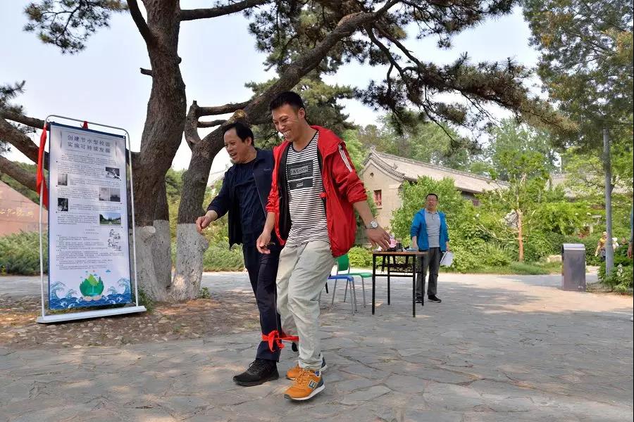 用绳子绑上两位参赛者的脚踝,团结协作走到终点。