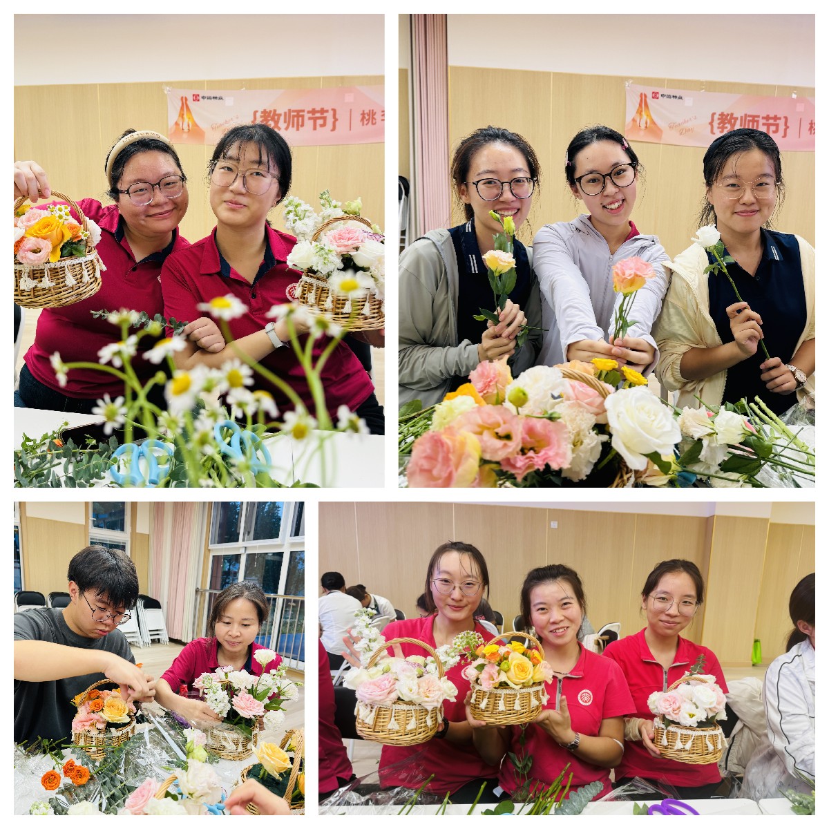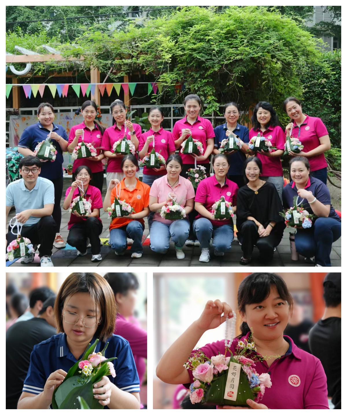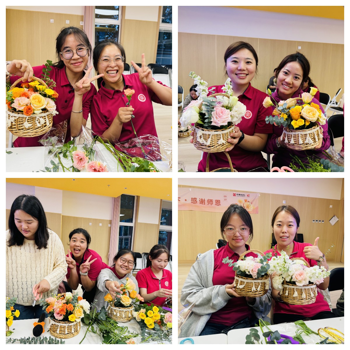 更加热闹非凡的是9月10日傍晚的新馨分园,同样为老师们举办了教师节艺术插花活动。老师们因香而聚,共赴一场与花的邂逅,新学期新馨分园任务艰巨,忙碌了一整天的老师们,放下疲惫沉浸在这芬芳的世界,共享花香四溢的教师节。活动现场花团锦簇,欢声笑语此起彼伏,老师们巧妙地将那些芬芳又光艳明媚的花朵搭配上小巧且绿意盎然的叶子,完成了插花作品,也是在这个教师节送给自己独有的那份心意,以独特的方式展现生活的诗意与优雅。