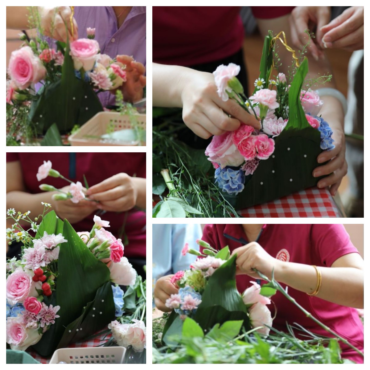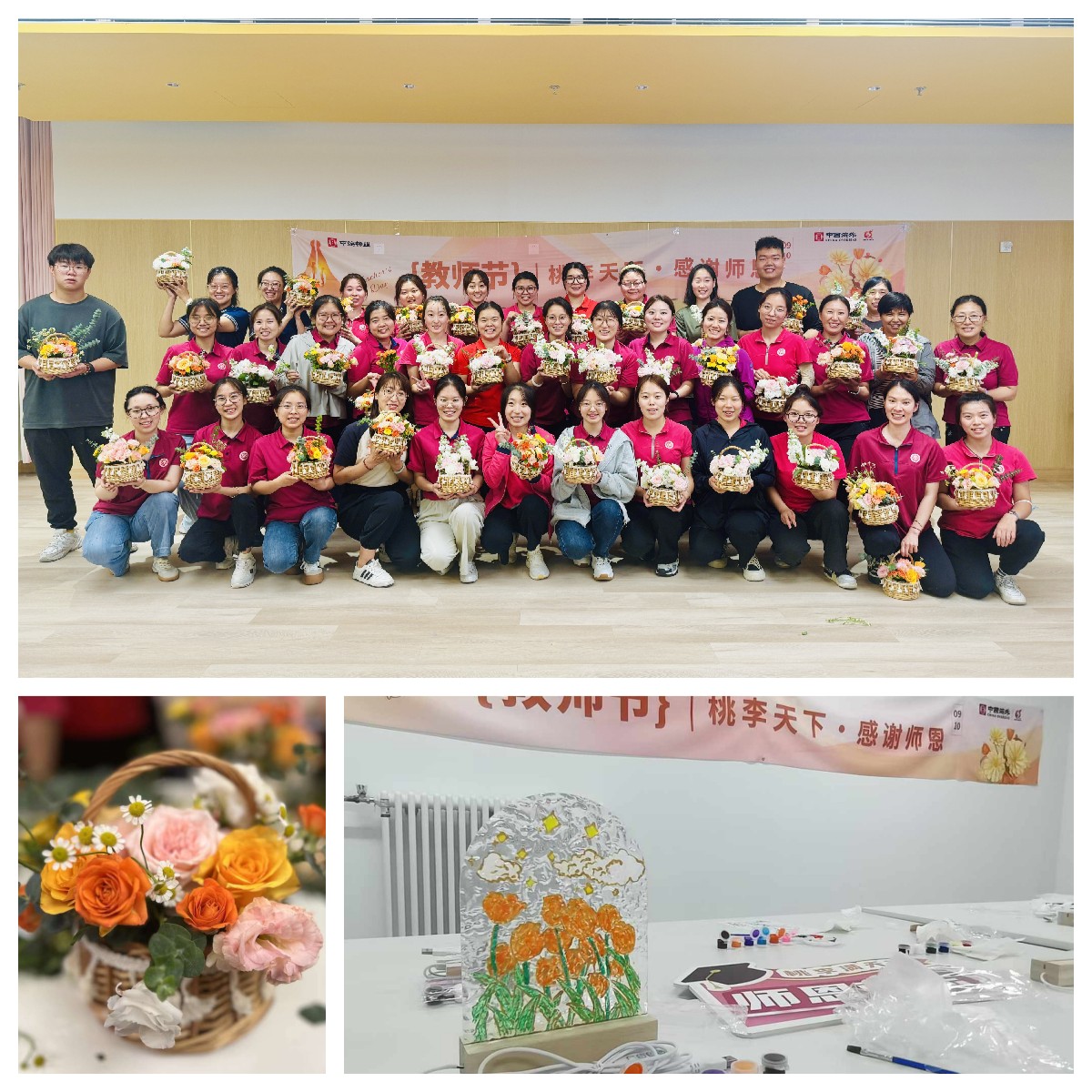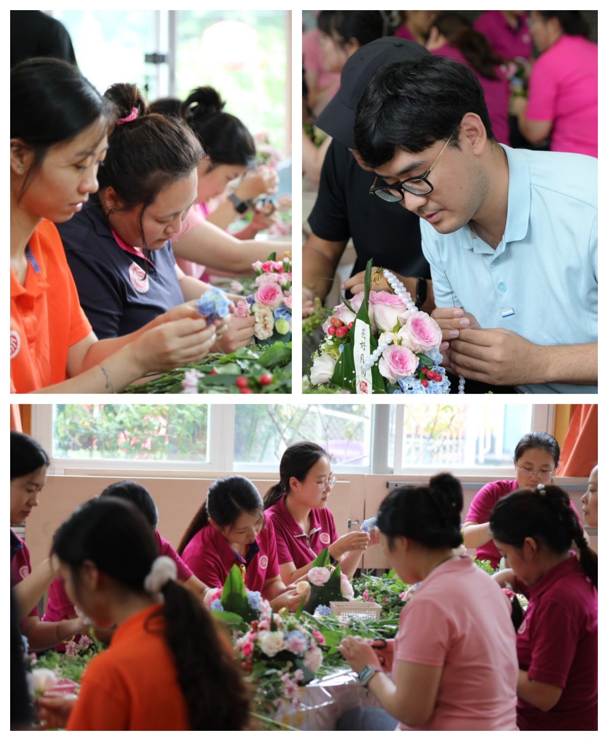 更加热闹非凡的是9月10日傍晚的新馨分园,同样为老师们举办了教师节艺术插花活动。老师们因香而聚,共赴一场与花的邂逅,新学期新馨分园任务艰巨,忙碌了一整天的老师们,放下疲惫沉浸在这芬芳的世界,共享花香四溢的教师节。活动现场花团锦簇,欢声笑语此起彼伏,老师们巧妙地将那些芬芳又光艳明媚的花朵搭配上小巧且绿意盎然的叶子,完成了插花作品,也是在这个教师节送给自己独有的那份心意,以独特的方式展现生活的诗意与优雅。