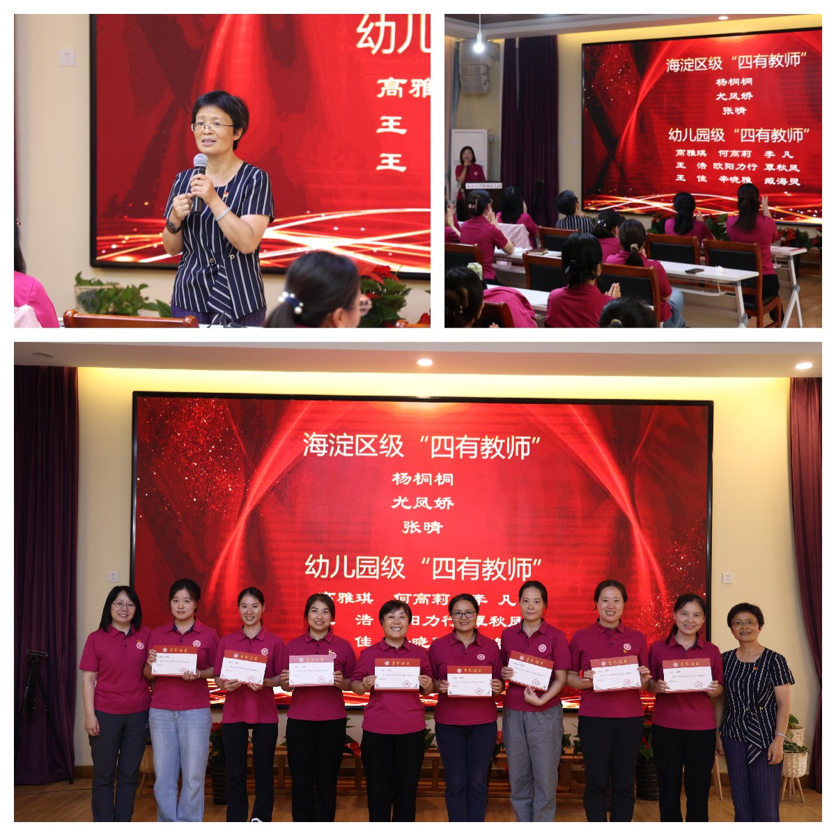 习近平总书记勉励广大师生做有理想信念、有道德情操、有扎实学识、有仁爱之心的“四有”好老师,附属幼儿园不仅有3位优秀的教师获得海淀区区级“四有教师”的光荣称号,还有9名老师被评为幼儿园园级“四有教师”,这份荣誉不仅是对老师们的认可,更代表着老师们践行着属于“人民教师”的责任与担当,在教书育人岗位上不忘初心,匠心前行!第三部分是由董晓华书记同附属幼儿园园长余丽老师一起为获得园级“四有教师”的老师们颁发荣誉证书。