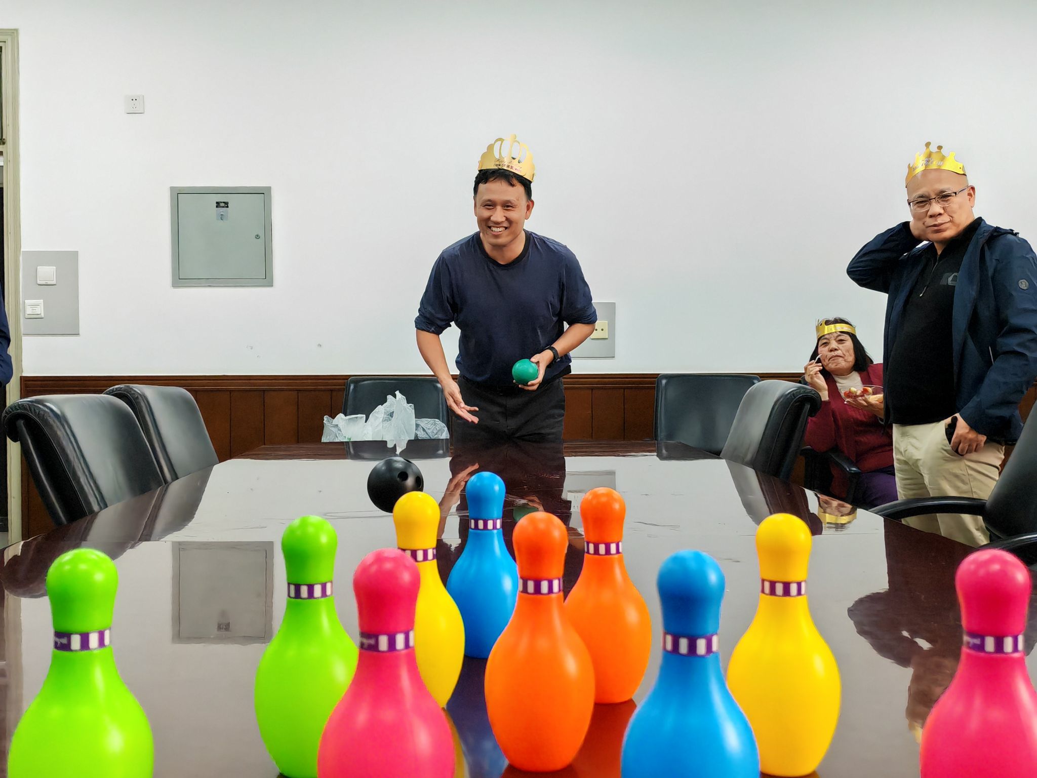 蛋糕分享过后,趣味十足的互动游戏环节将现场气氛推向高潮。本次活动精心设计了 “保龄球比赛” 和 “滚水瓶” 两个小游戏。在保龄球比赛中,老师们热情高涨,纷纷上前一展身手,每人拥有 3 次投掷机会,大家全神贯注瞄准目标,不时为彼此的精彩表现欢呼喝彩,最终分数最高的前五名老师收获了专属的精美奖品。而 “滚水瓶” 游戏则充满了未知与惊喜,工作人员将“留香珠”“象棋”“手套” 等奖项写在纸条上并一字排开,老师们依次滚动水瓶,水瓶停下时指向的纸条便是对应的奖励,每一次开奖都伴随着阵阵惊喜的欢呼,大家在轻松有趣的游戏中尽情释放压力,享受欢乐时光。