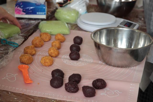 青色的麦草汁与糯米粉结合,做出清新软糯的青团皮,肉松咸蛋黄沙拉酱不停搅拌,形成咸香又富有层次的馅料。称重、搅拌、包馅、塑形,老师们一步步认真地学习和执行菜谱上的步骤,做出了一个个或浑圆或别具风格的青团们。