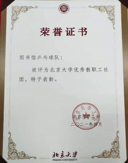 我们的球队犹如一个温暖的大家庭,队员之间团结、友爱,气氛和谐、融洽。没有心胸狭隘之人,没有萎靡不振之气,积极进取,乐观向上。在赛场上,守纪律,听指挥,无私心,有担当;有勇有谋,有胆有识,坚韧不拔,顽强拼搏,体现了北大图书馆人的精神风貌!疫情期间的2021年,北京大学工会授予我馆乒乓球队“北京大学优秀教职工社团”的荣誉,这是对我们15年来的坚持和所取得的成绩的肯定与褒奖。我们相信,这份光荣会继续传承下去,并不断发扬光大!