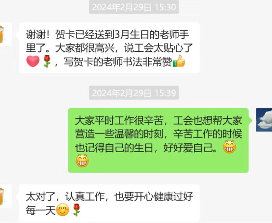 在每位馆员的生日当天,图书馆各部门工会小组长会准时将明信片送到他们手中。收到明信片的馆员们纷纷表示,这份特别的生日祝福让他们感受到了工会大家庭的温暖和关爱,也让他们更加坚定了为图书馆事业贡献力量的决心。