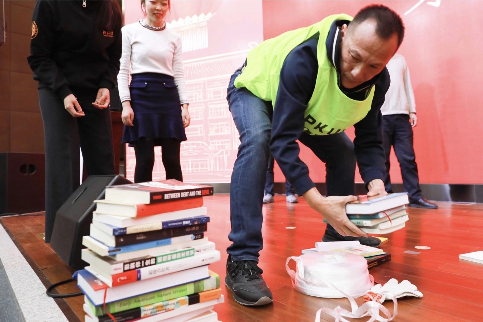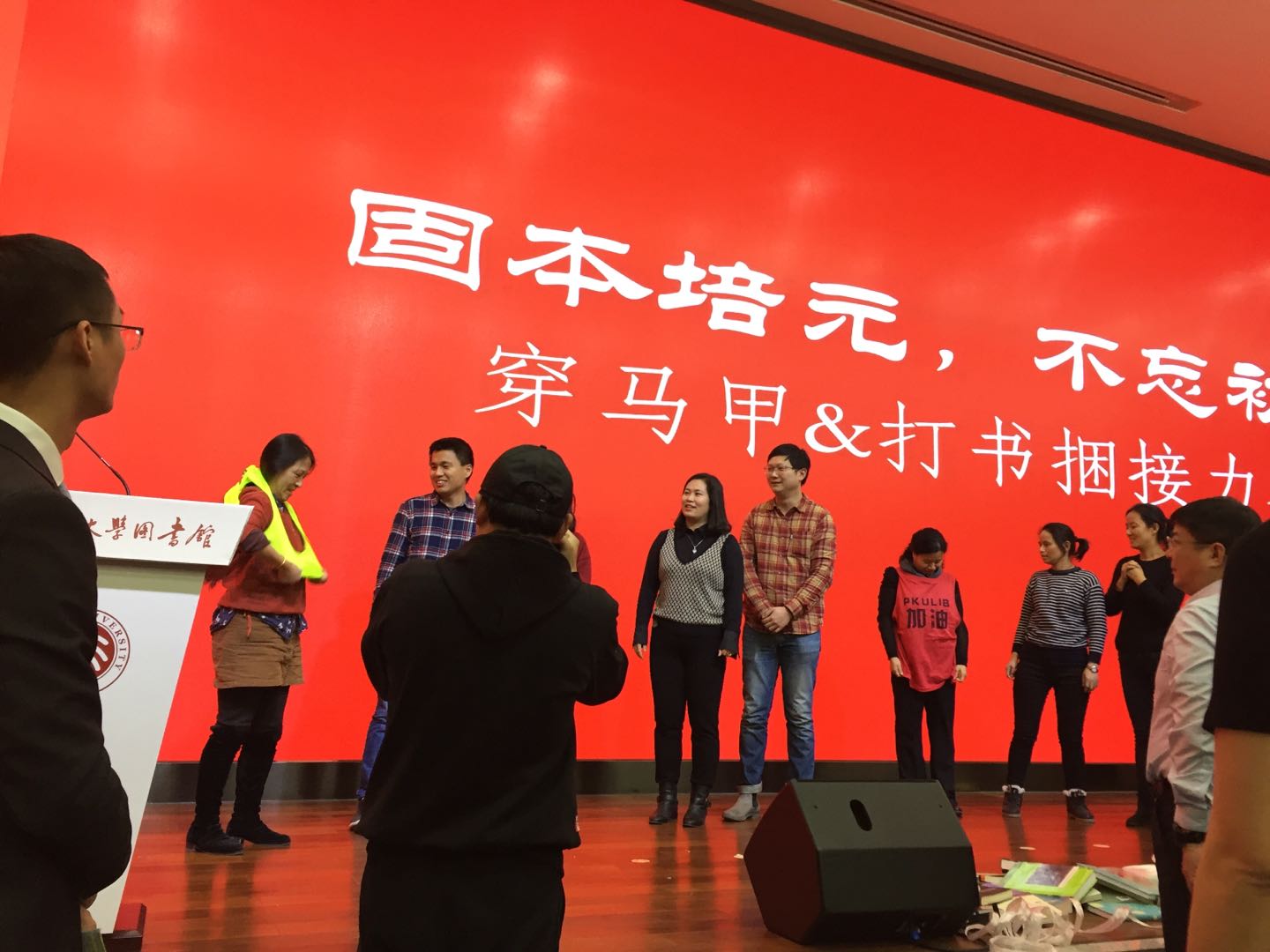 到“固本培元,不忘初心”互动游戏环节,各部门大展基本功,在紧张激烈的氛围中接力穿马甲、打书捆。馆领导更是集体上阵,助力打捆比赛。台下不能上场的馆员一边看的前仰后合,一边摩拳擦掌跃跃欲试。大会气氛热烈而欢乐。
