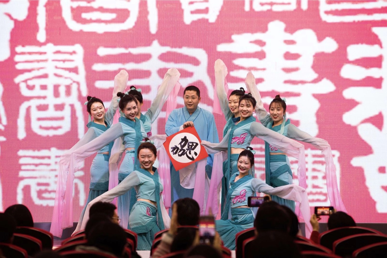 古色古香、优雅娴静的舞蹈《生僻字》把大家带进联欢会的氛围中。在曼妙的舞姿中,图书馆馆员王铮上台现场泼墨挥毫,写下“勰”字,表达全馆齐心协力、共赴辉煌之祝愿。紧接着全体教职工一同观看了视频《苍颉的字,我们的故事》,品味北大图书馆2018年度汉字,妙趣横生的视频让整个会场弥漫着文字之美、书画之香、文化之魅。