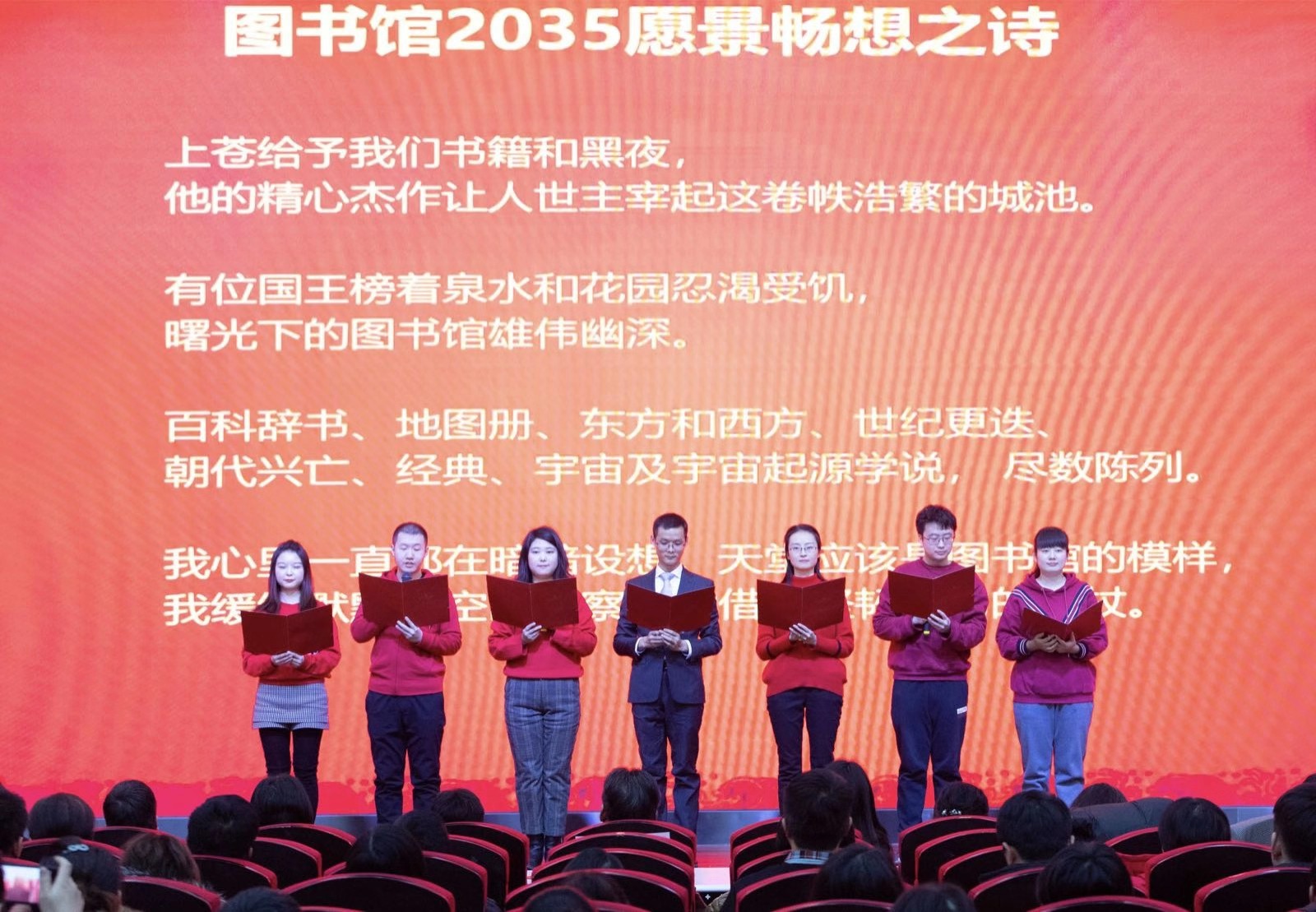 热热闹闹的抽奖环节后,今年入职的新馆员闪亮登场,他们自编自排的诗朗诵《图书馆2035愿景畅想之诗》境界高远,文辞优美,昂扬的精气神获得全场热烈掌声。