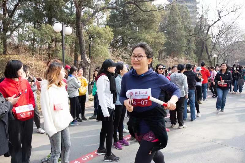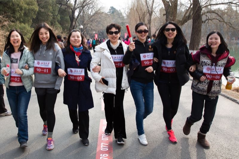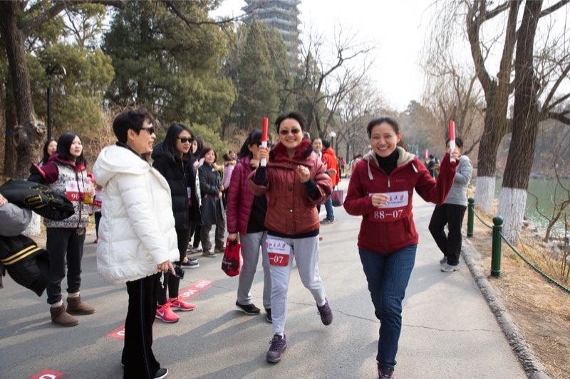 活动当天,阳光晴好,未名湖水碧波荡漾。虽然参与人数多达千余人,但活动井然有序,热闹非凡。图书馆10支队伍早早抵达活动现场,聆听了领导“为祖国健康工作五十年”的寄语。图书馆的女教职工们在无拘无束的奔跑中感受着青春的活力、春日的温柔和节日的欢乐,释放了独特的女神魅力!
