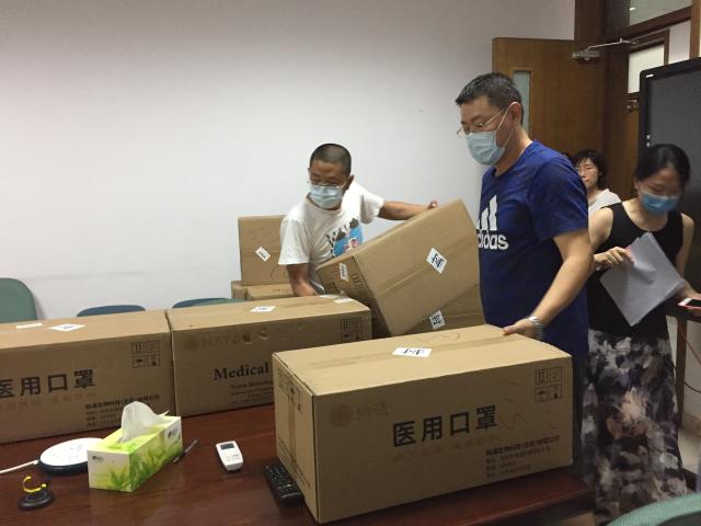 图书馆工会委员在清点口罩,准备分发到图书馆各部门