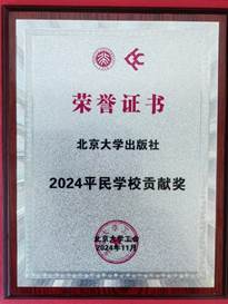 2024年11月18日晚,北京大学第17期平民学校结业典礼在百周年纪念讲堂李莹厅举行。北京大学工会授予北京大学出版社“2024平民学校贡献奖”。这份荣誉充分肯定了北京大学出版社在支持和推动平民教育、促进社会平等、推广文化普及和热心教育公益等方面所做的工作。