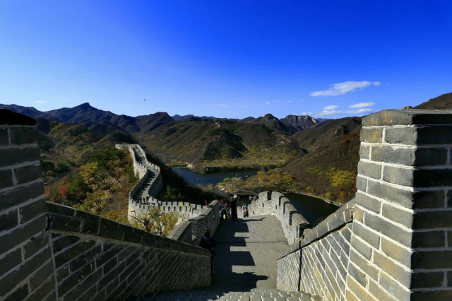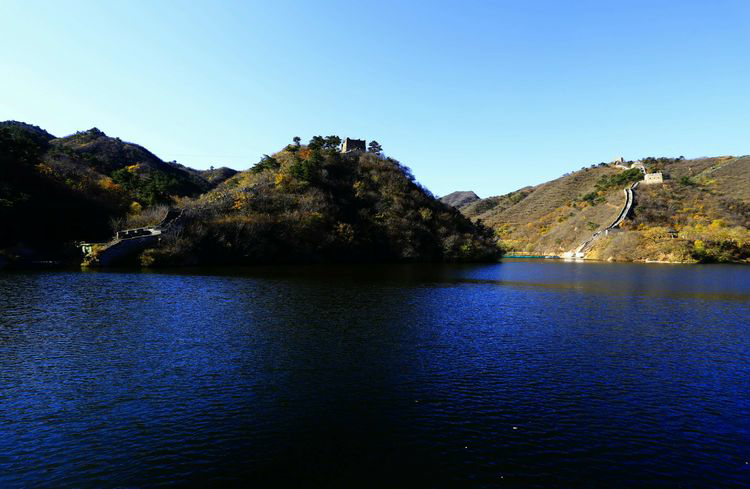 我们顺着原路返回到半岛,出来左走上了长城,长城上有一团建队,估计得有100多人,颇为壮观。我们怕影响他们,快速通过。从长城顶上俯瞰半岛,还是比较不错的。
