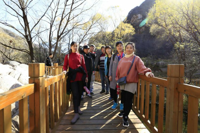 10月27日早6:30,我们储运部工会小组准时从库房出发,路上和社工会王艳老师联系了一下,得知她就在我们的车后面一点,大约9点,我们到了水长城景区。保国带来了条幅,大家在门口合影留念后就进入景区了。