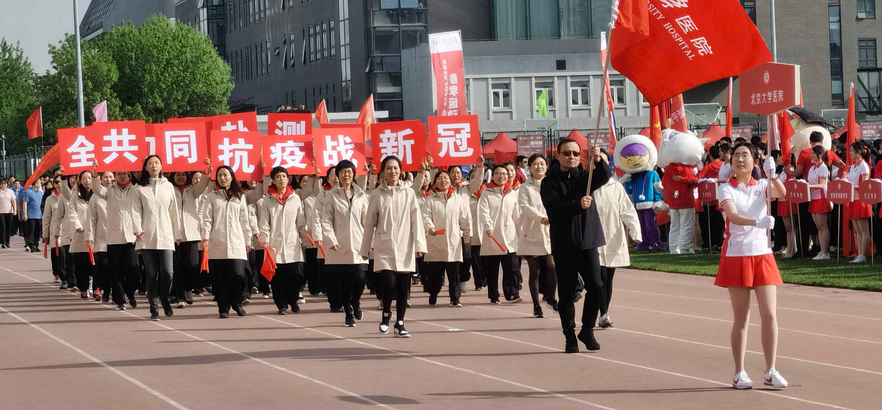 人间四月芳菲尽,五四体育场绿茵茵、充满生机的草坪上又迎来了2022年大学生春季运动会。校医院的员工们在紧张的抗疫工作之余,传承校医院的光荣传统,积极参加各项比赛,在运动场上燃烧汗水与激情,绽放着青春与梦想。入场式,大家踏着坚实的步伐,高举战斗的誓言,齐声高呼:“共同抗疫战新冠、全力以赴测核酸”,代表着守护全校师生健康安危的决心,作为健康的守护者的我们,无数日夜的奋战,不忘初心,坚定向前,永不放弃。