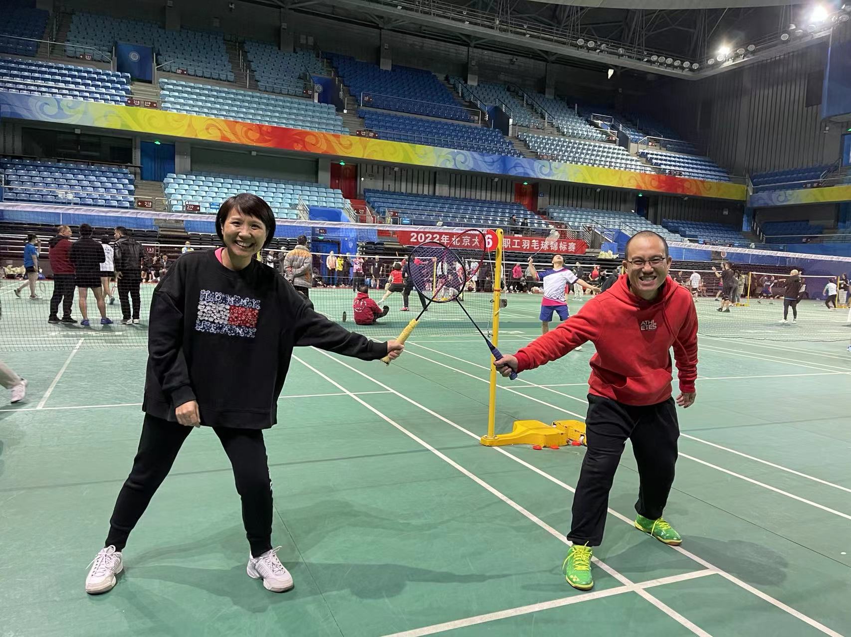 秋风拂过,银杏金黄,红枫装点其间,燕园秋意正浓。在这收获的季节里迎来了2022年北京大学教职工羽毛球锦标赛。10月31日比赛正式拉开帷幕,校医院羽毛球队分成两组进行男双、女双、混双小组赛。球场上热闹非凡,让人热血沸腾。伴随着精彩的扣杀,巧妙的吊球、高远球,观战的人群中不时爆发出一阵阵喝彩声,赛场内外一片热情洋溢!