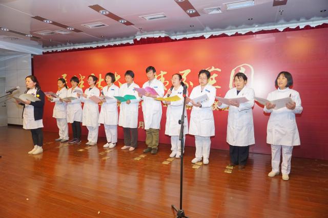 医师代表内科主任李卫菊、护士代表内科病房粱果分别致辞。春风夏雨、秋霜冬雪,滋润着我们北大医院人心底的白衣梦想,凝聚着我们北大医护人员的豪情,铸造出北京大学医院的灿烂辉煌!李卫菊主任原创的一首配乐诗朗诵《我们一起走过》掀起一个高潮,揭开了文艺表演的序幕。