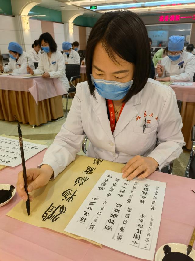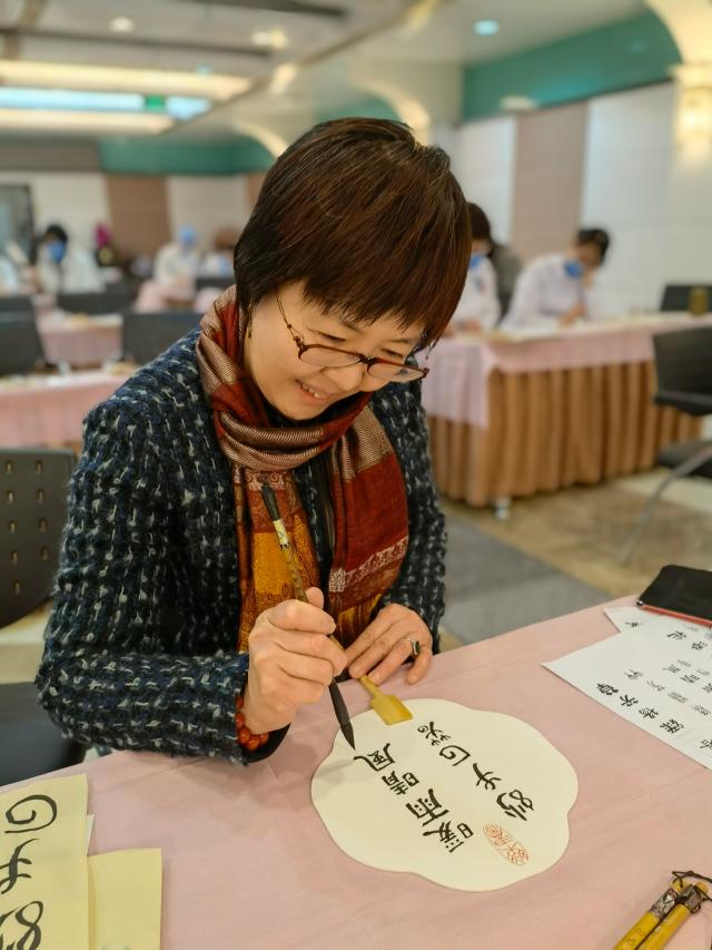 医院工会领导特邀“一相书画”工作室的北京大学校友书画协会书法公益班讲师沈海娃老师和李敏老师为大家授课,用篆书和隶书书写扇面。老师讲了篆隶的起源和发展历程,溯本求源,中国书法艺术根基雄厚历史悠久。从甲骨文到秦代李斯的小篆,再到秦汉隶书,隶书上承篆书下开魏晋、南北朝,直至五体的完整体系的形成。学习中国书法艺术成为了解中华文化的重要一环。