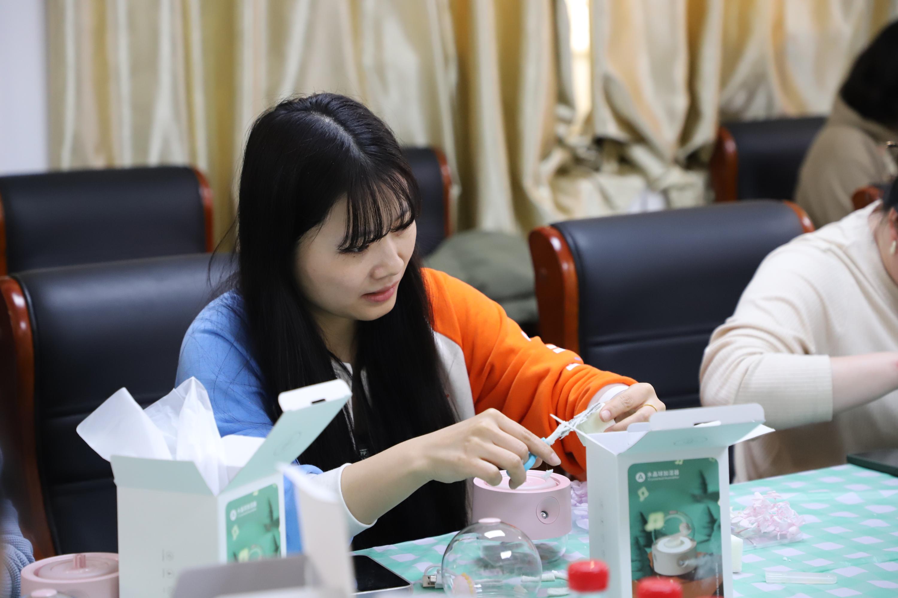 郭老师不仅结合图文资料介绍了修剪和创意的技法,还亲自演示了每一步制作过程,鼓励大家在制作过程中“以花为媒,放松身心,表达心意”。经过近一个小时的耐心创作,一件件美丽又实用的永生花加湿器呈现在大家面前,不仅是一份物品、一份祝福,更是一份心意、一份关怀。