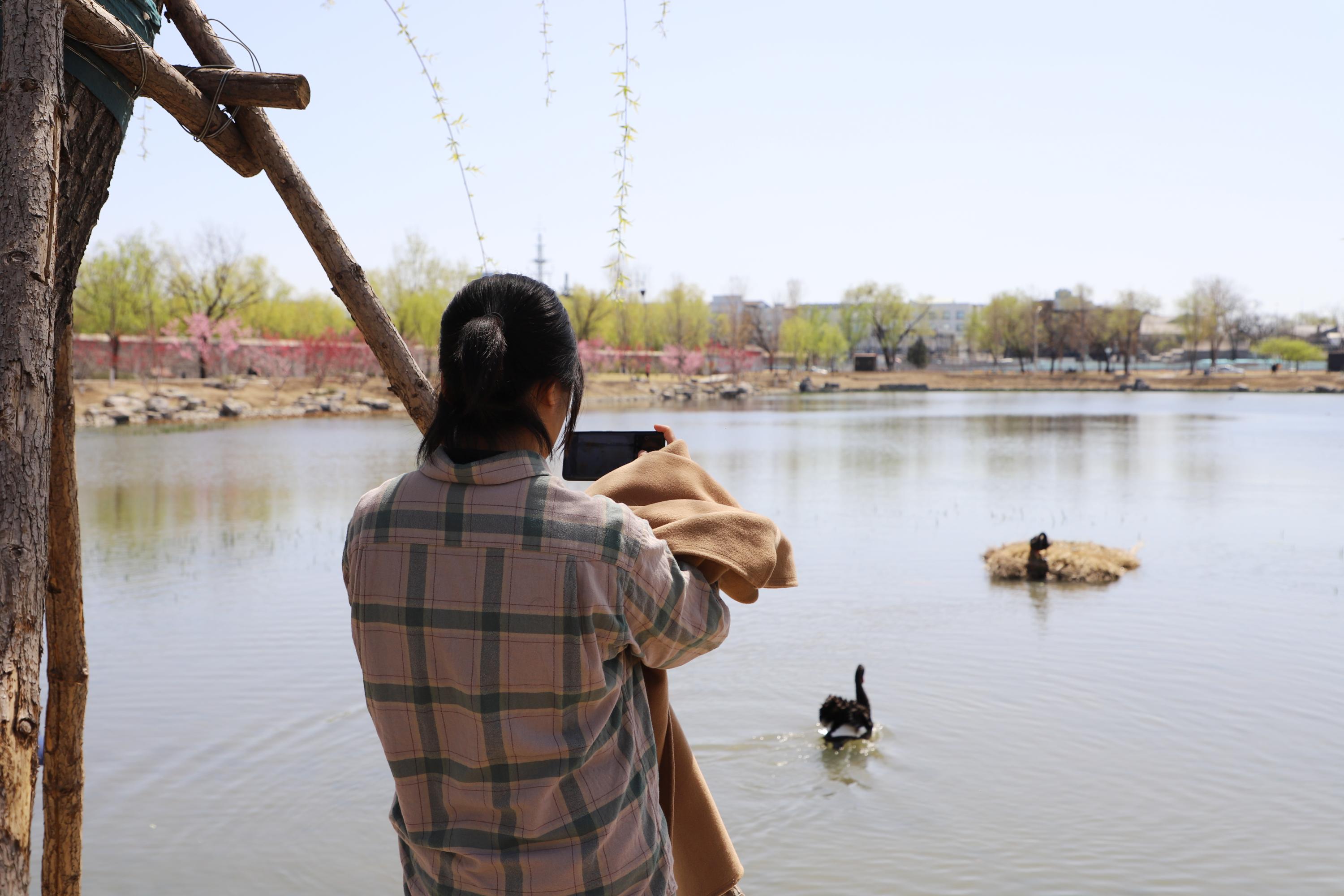 公园内的碧桃、玉兰竞相开放,湖边绿草如茵,桃柳相依。波光粼粼的湖面倒映着蓝天白云,优雅的黑天鹅在湖中悠闲漫步,为这幅春日画卷增添了几分生动与灵性。职工们纷纷驻足拍照,记录下这美好的瞬间。