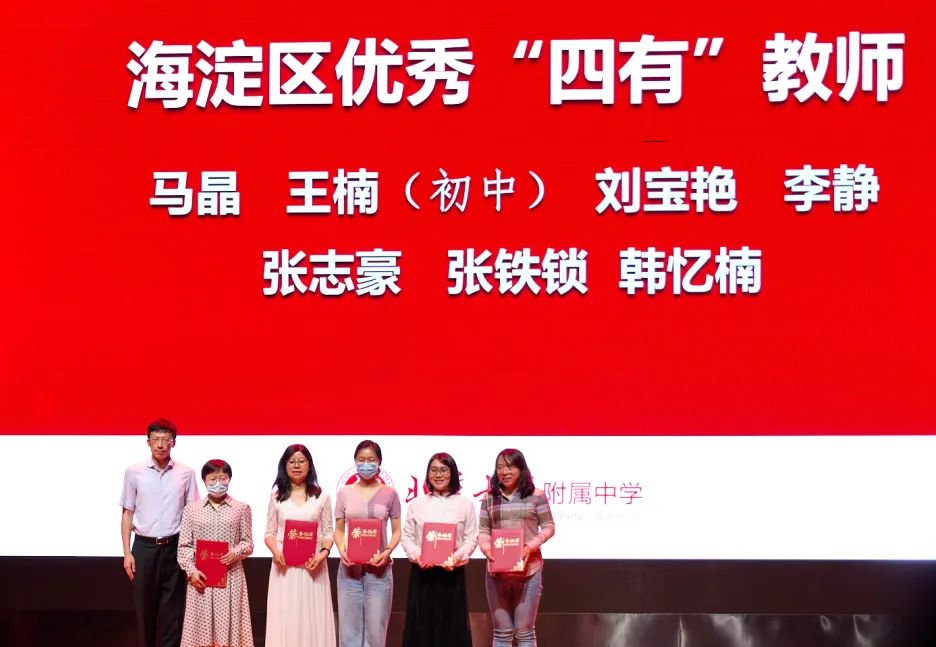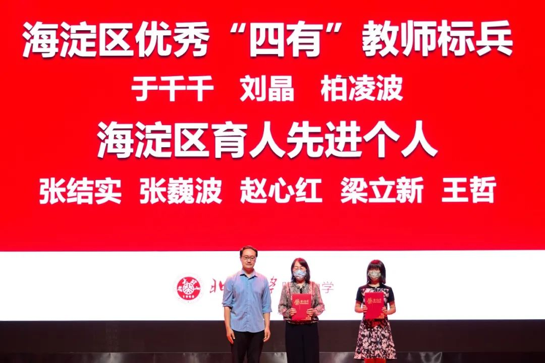 北大附中党委副书记、副校长李明为获得海淀区“四有教师”奖的老师颁奖