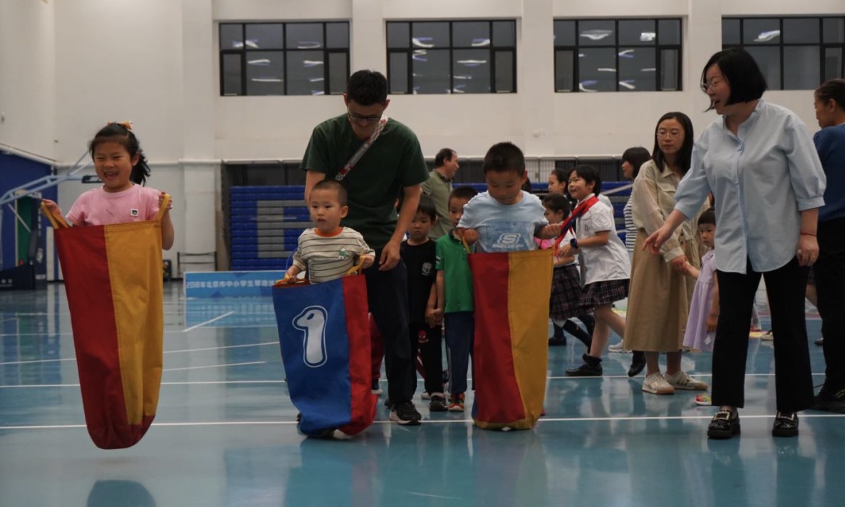 做完风筝,孩子们来到附中欣建体育馆综合馆,12岁以下的小朋友选择了不同的趣味项目,袋鼠跳、手脚并用、小兔子过河(亲子)、套圈、团结一心(亲子)、丢沙包、车轮滚滚、穿针引线(亲子),孩子们在附中体育老师的组织下,开心的参加各种活动,体育馆内充满了欢乐的笑声。