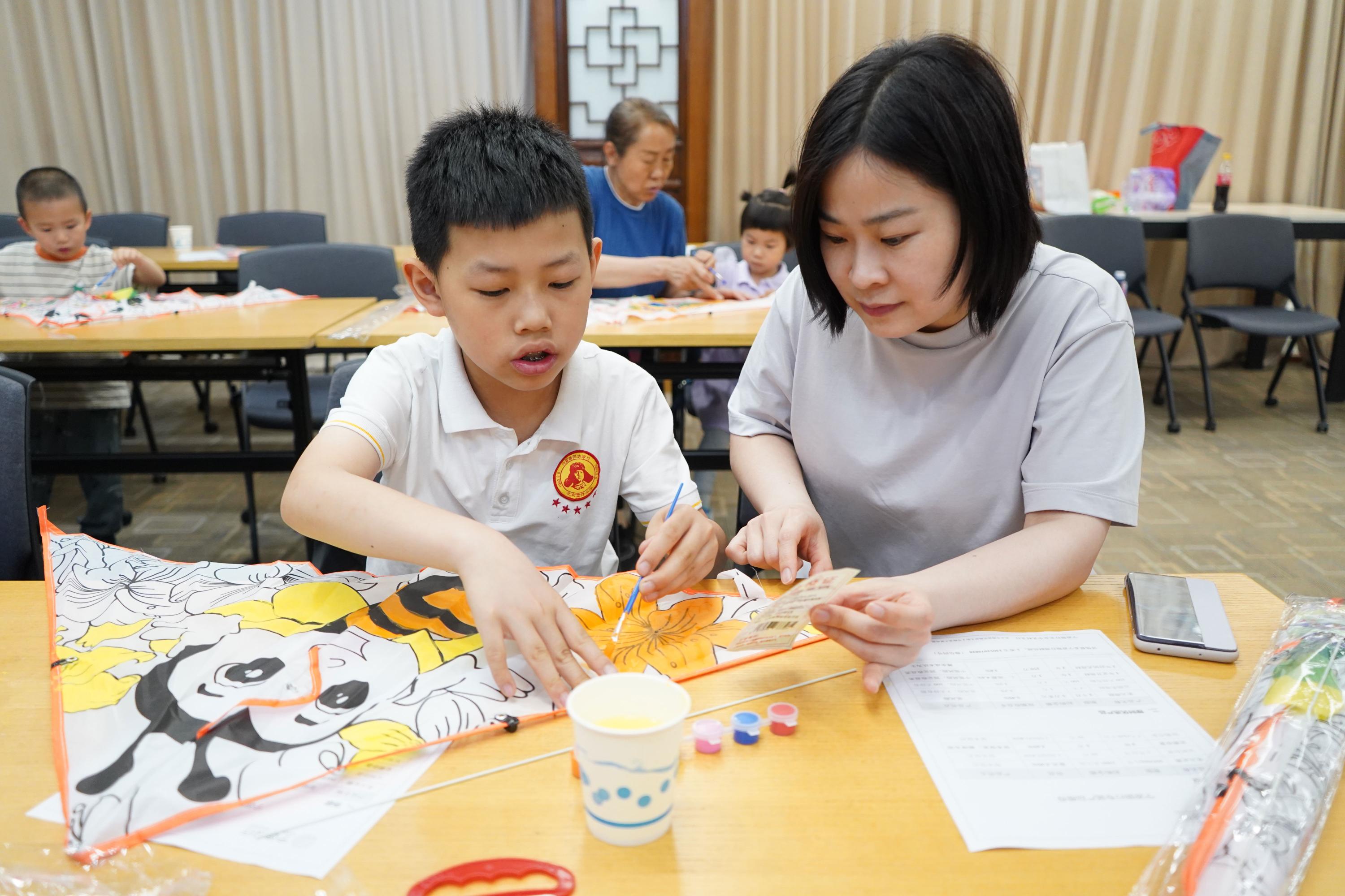 5 月 31 日下午15:30,“童心飞扬 手绘风筝”主题活动在附中食堂四层会议室举行,孩子们好奇的看着风筝制作的材料,迫不及待的想动手一试。活动开始,主持人介绍风筝的历史文化典故和风筝的用途,孩子们认真的听着老师的讲解,已经上小学的同学,对风筝的文化典故很感兴趣。在动手制作环节,老师先给孩子们分发空白风筝半成品,颜料,画笔等,孩子们拿到材料以后,开始创意绘画,工作人员现场指导孩子们涂色,最后评选最美风筝和最佳色彩奖。