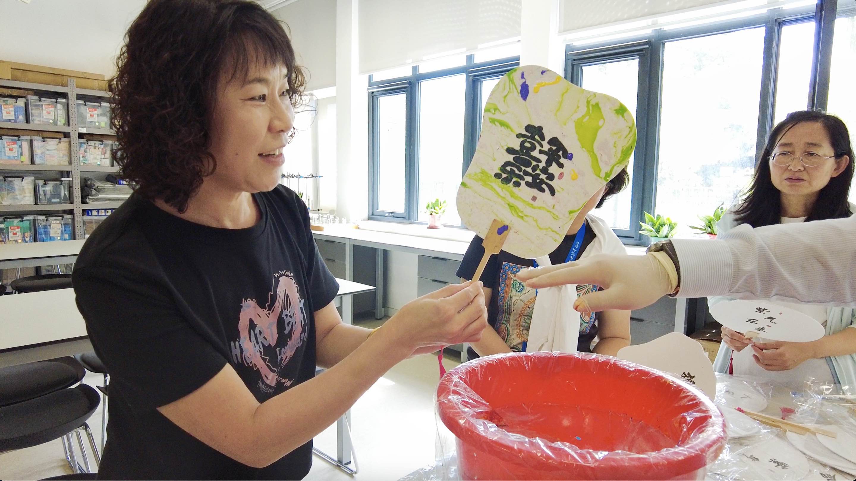 在老师的指导下,大家带着好奇的表情,专注地投入到漆扇的制作中。大家拿着心仪的扇子缓缓放入有漆料的水中,或垂直、或旋转扇子,让色彩在扇面上自由流淌,形成独一无二的图案,原本素净的扇面逐渐变得色彩斑斓、生动活泼。