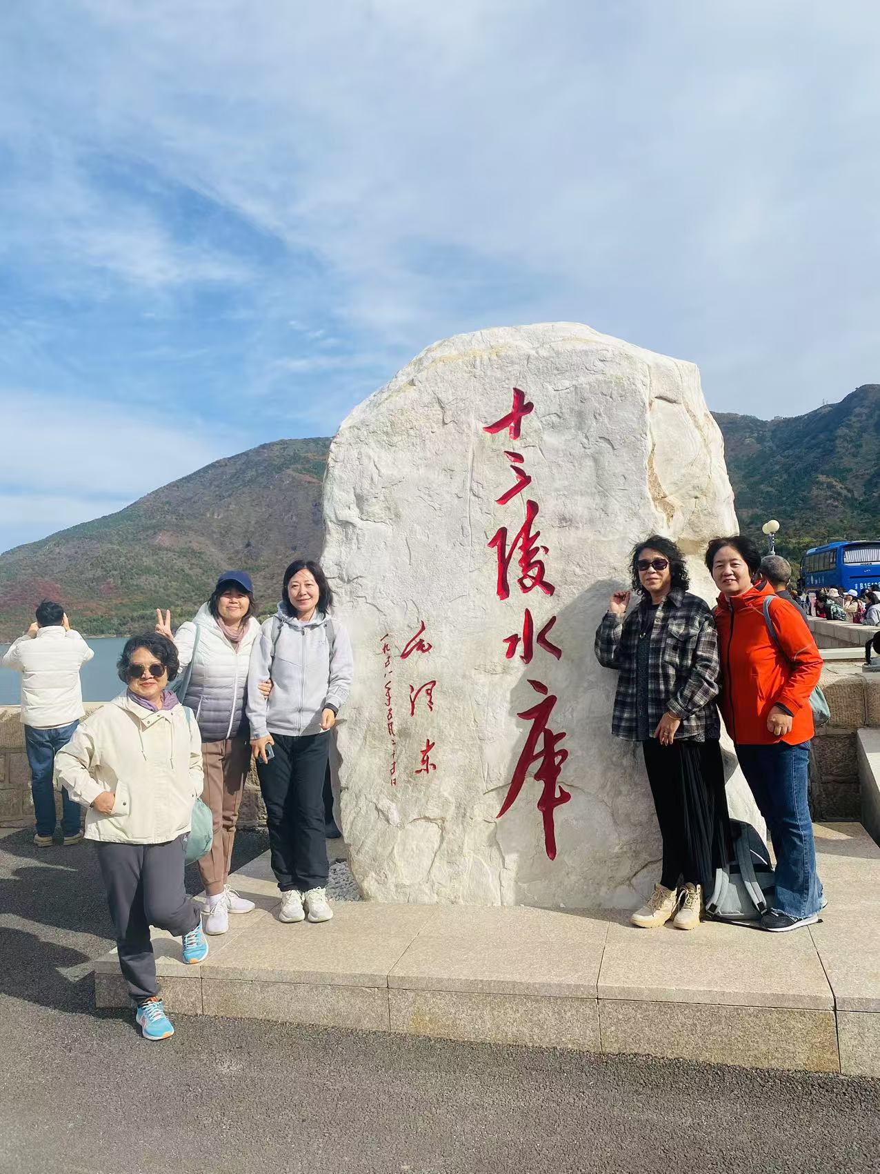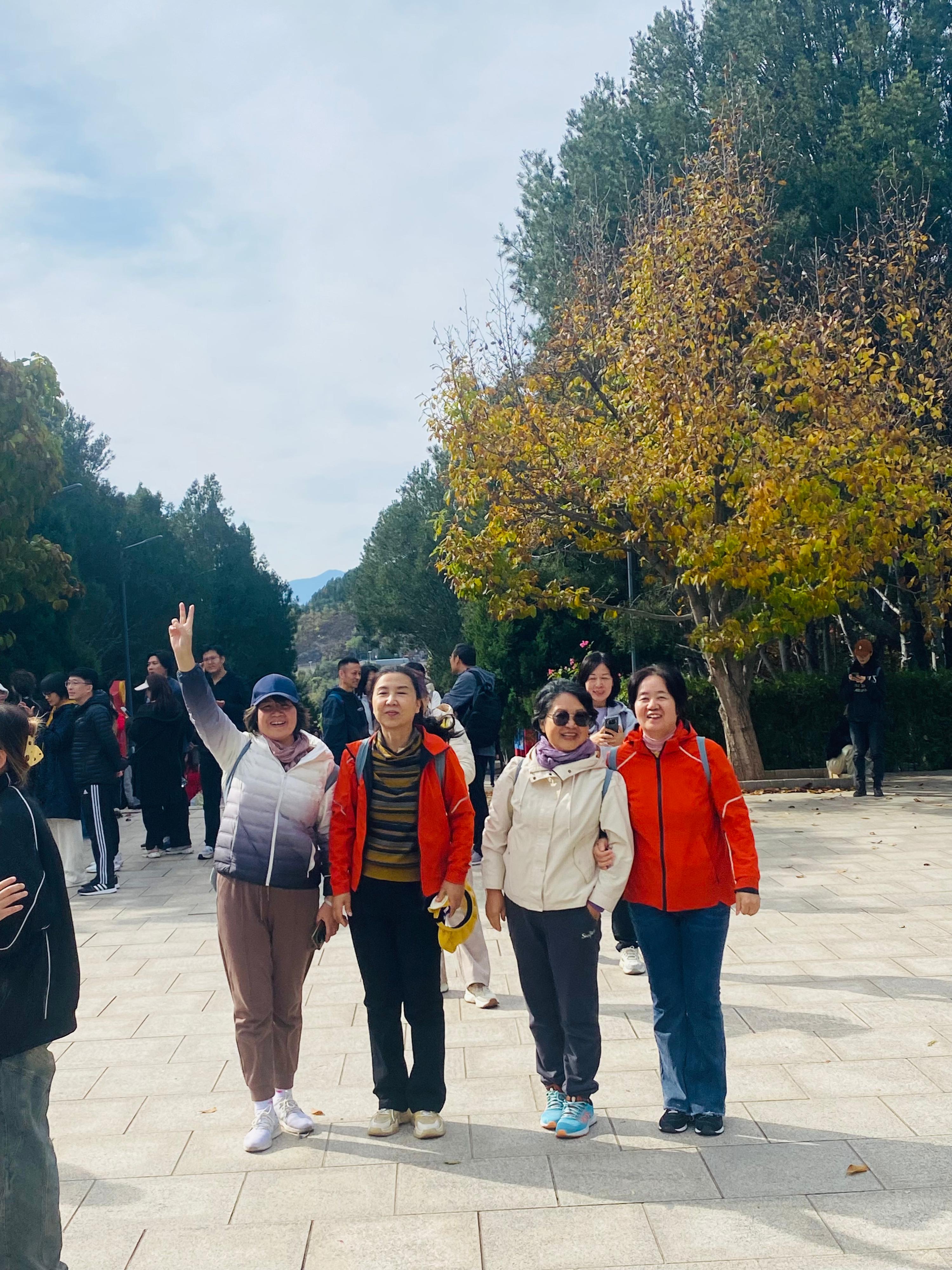 下午,老师们安排前往十三陵水库参观。选择十三陵水库是一个极佳的选择,这里不仅有清澈的湖水、环绕的群山,还有五彩斑斓的秋叶,构成了一幅动人的秋日画卷。老师们言谈中,感慨十三陵水库建设的火热场景。1958年1月21日开始动工建设十三陵水库,5月25日,毛主席、周恩来总理、刘少奇、朱德等中央领导人来到十三陵水库的工地上,参加了义务劳动。全体建设者们大受鼓舞,热血沸腾,终于在6月30日竣工,赶在了雨季洪水到来之前完成了水库建设。