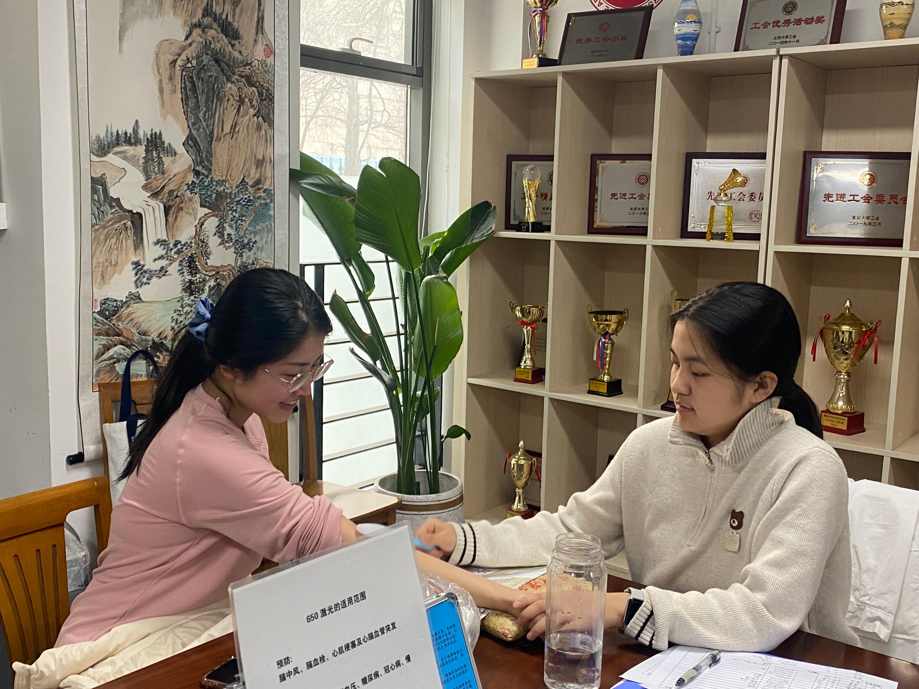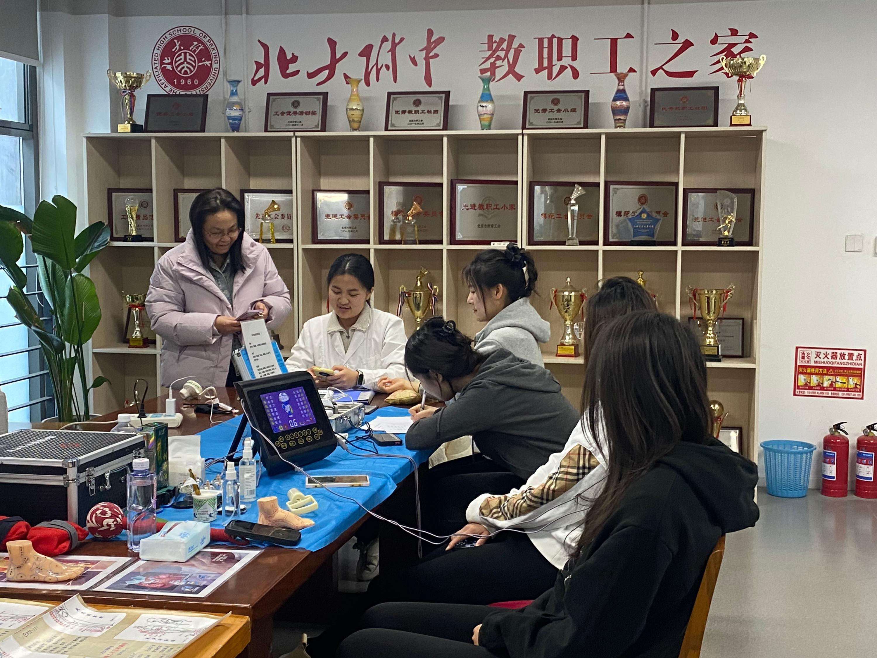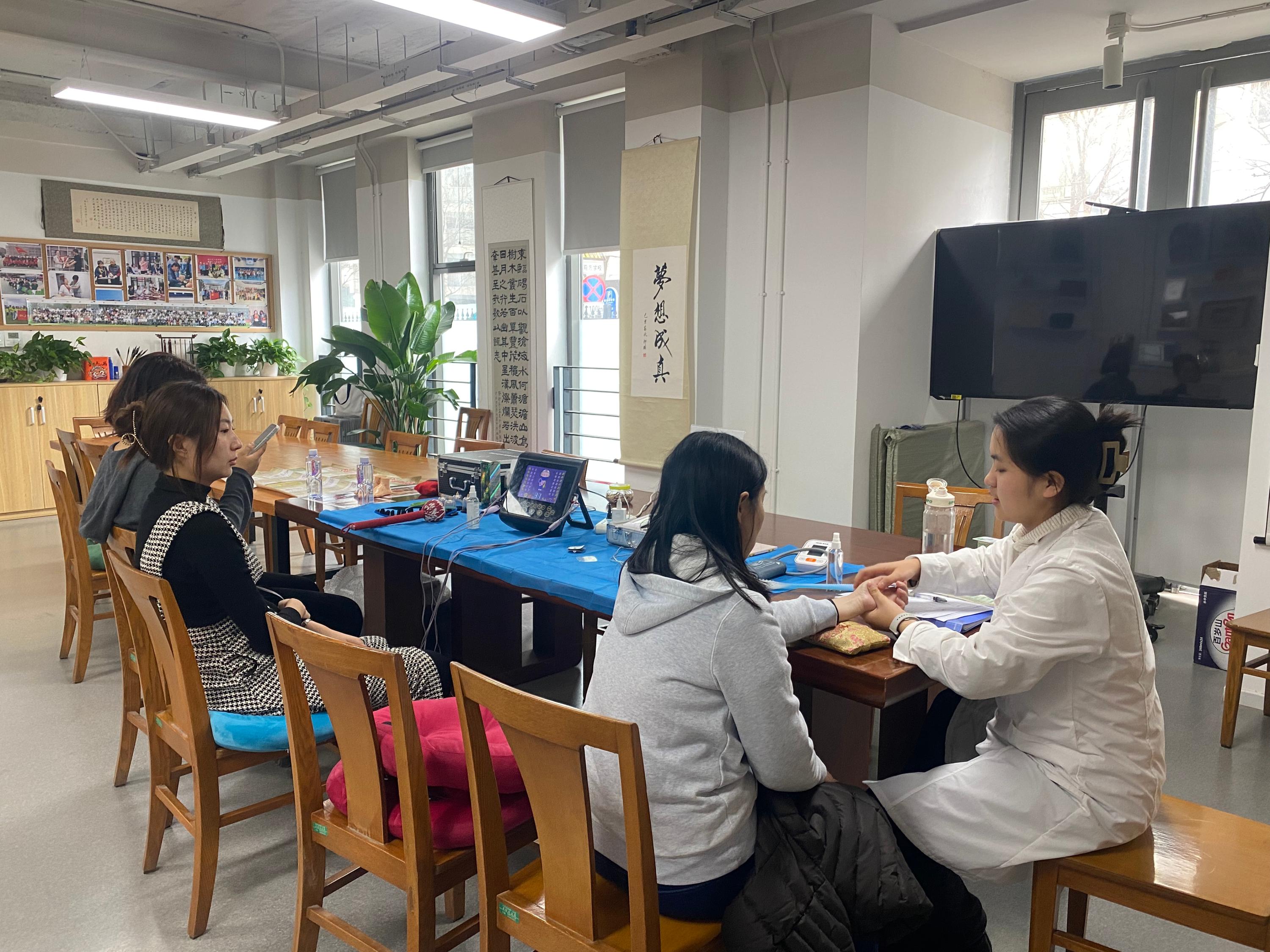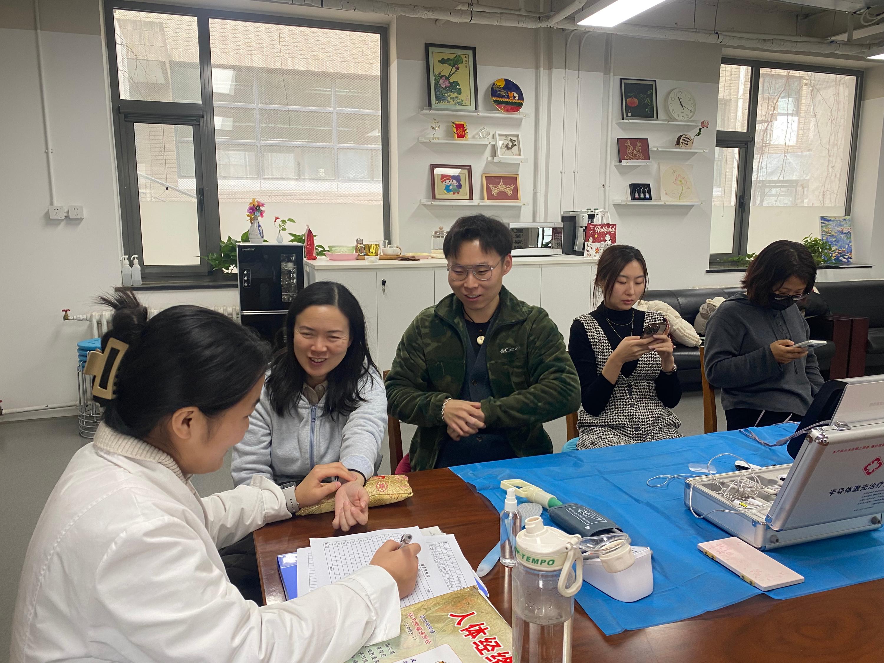 中医研究院健康研究所的医生在“健康到单位,温暖你我他”的理念指导下,进行亚健康及慢性病的预防和治疗科普调研。医生给附中教职工号脉诊病、检查颈椎、肩周、腰椎、关节、血压测量、根据员工身体症状需要和个人要求,给员工进行艾灸、拔罐、刮痧、推拿、针灸等调理治疗,并给予专科诊疗建议。