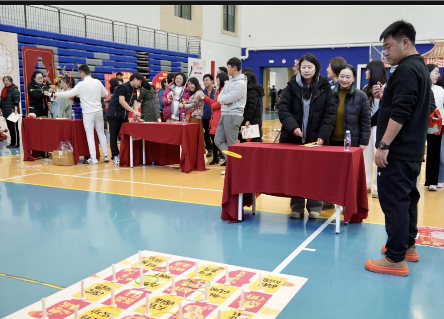 本场游园会由“体育区”“艺术区”和“科技区”三个分区组成“传统与创意”相结合的游园景观环境。送上“福”字春联拉来游园会的序幕;心意满满的祝福卡抽取,抽到啥都满意;祝福红包人人有,1角1元情意重;现场参与师生通过集章打卡抽奖兑换心仪奖品。16个项目极具趣味性和互动性,传统与现代结合,游戏性强,覆盖面广,难度适中,既达到全民参与体验的效果,亦可让有专长的教职工一展实力与风采。教职工们沉浸式畅游体验,时而化身神箭手,时而化身雅士仕女;时而投壶10投8中欢呼雀跃,时而书写春联效果堪比书法家;时而研究乒乓球的投掷角度用力程度,时而琢磨气球带动小车奔跑的速度;时而比较大小球投掷目标的选择,时而思考接触箭矢何部位效果最优......就连计时团体合作搭建稳固模型,都被大家回味出应对出发情况反应速度和理性行动的问题。哈哈,老师们这是下意识地把钻研精神带到游园会上啦。当然其实游园会上,充满着欢声笑语、鼓掌喝彩,相亲相爱,喜气洋洋。一年的辛勤和收获这时都化为快乐,幸福洋溢在每个人的脸上。现场热度持续升温,气氛热烈,高潮迭起。