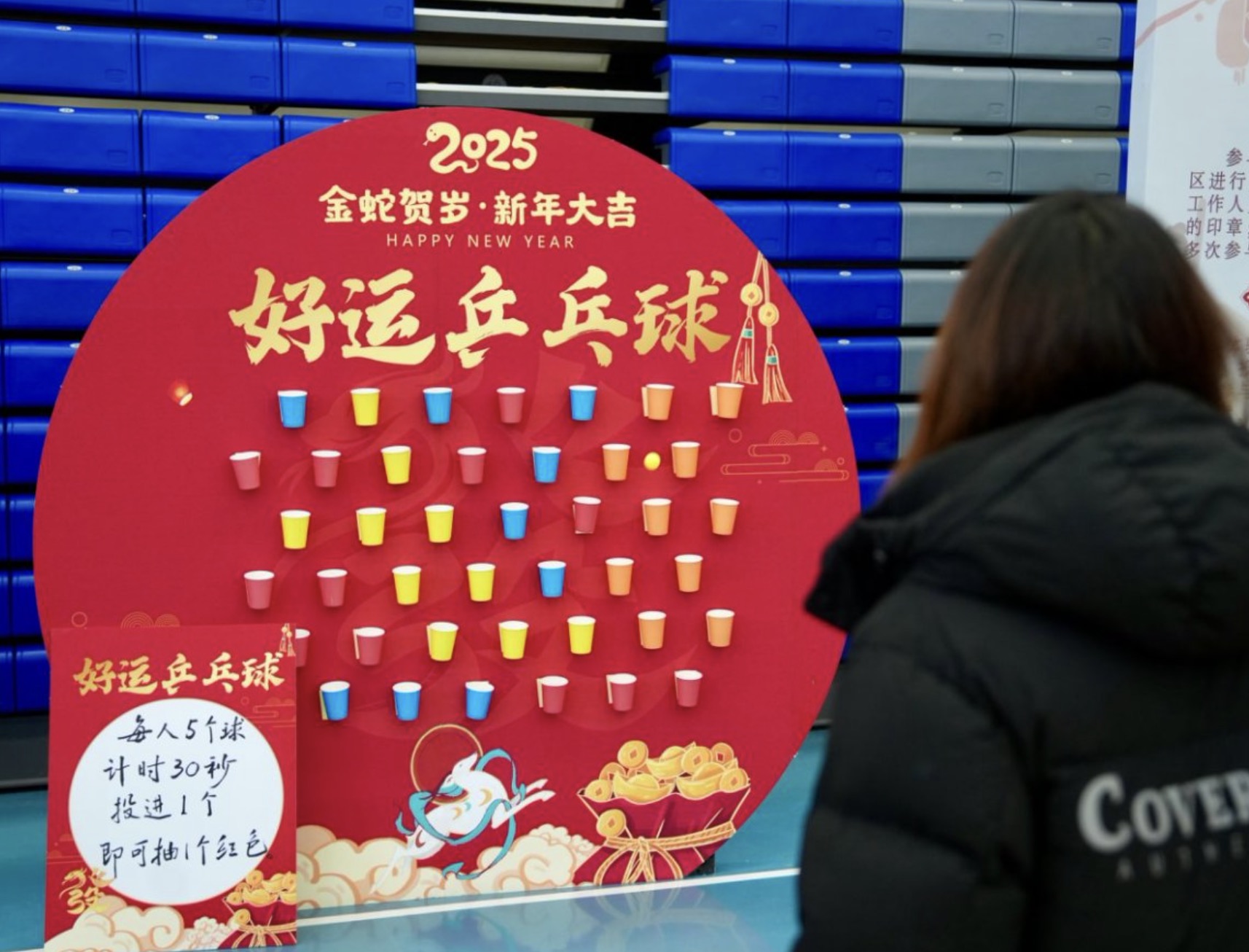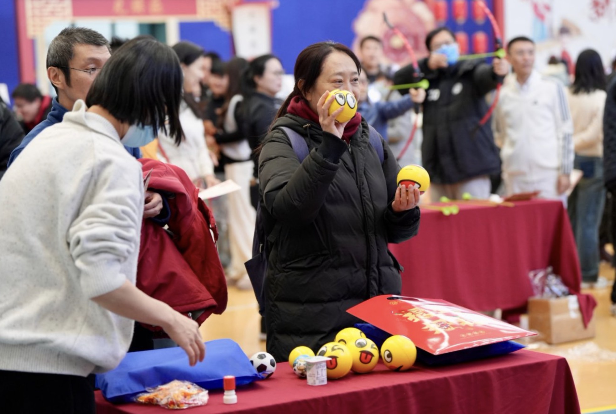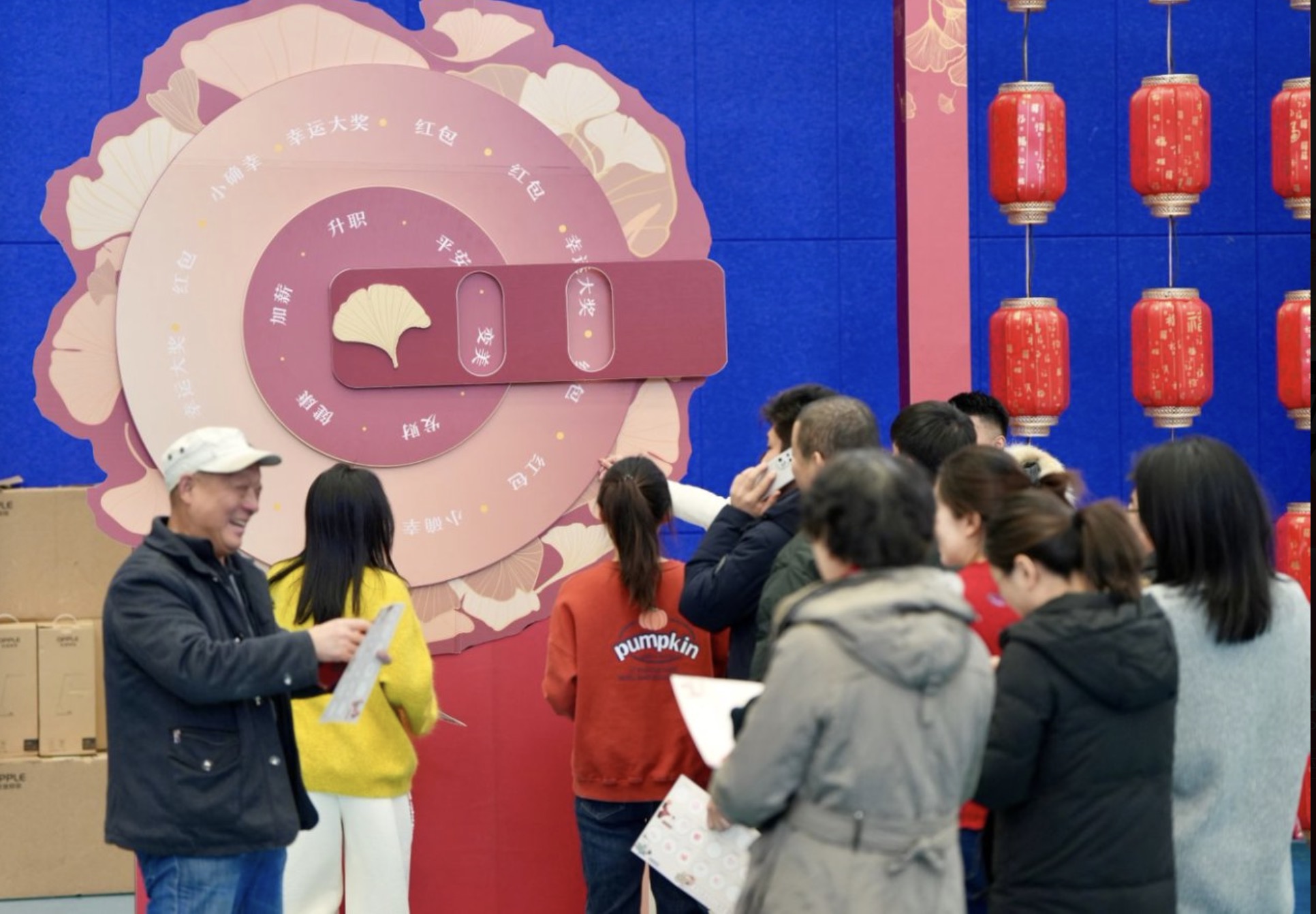 一切准备就绪迎接大家。全方位、立体化、多层次的景观布置和创意装饰遍布馆内每个角落。灿烂的灯笼、亮丽的红包墙、火红的抽奖转盘、律动的音乐、一道与楼上同样典丽但别具特色的主题门营造出欢乐祥和、喜庆热烈的节日氛围,更不要说有料又有趣的16个游园项目。