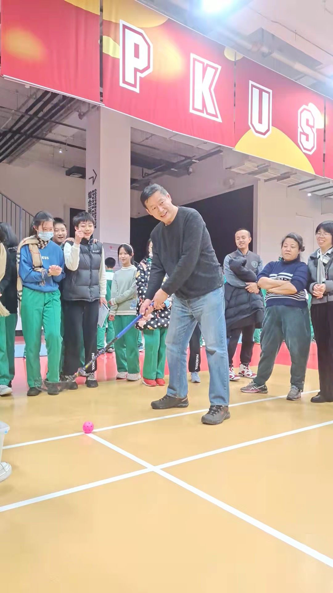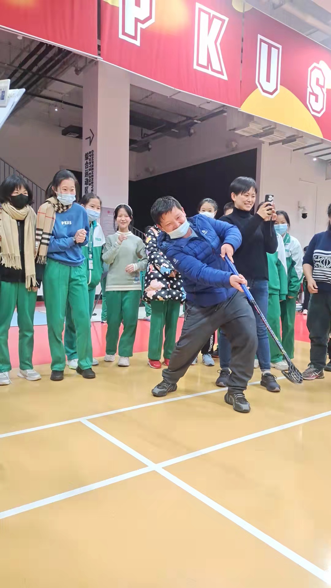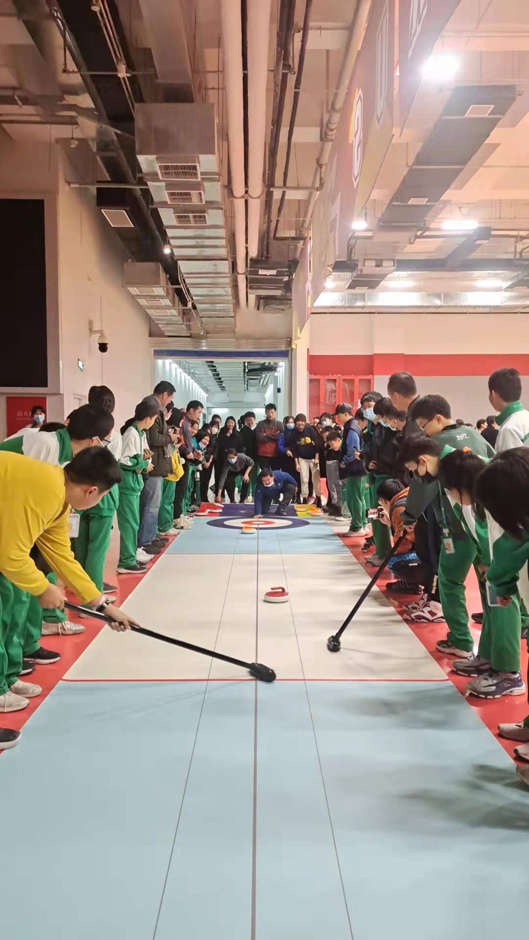 在冰壶区,老师站在前面参加比赛,努力打好每一个球,学生们围在两边为老师们加油,气氛非常热烈。
