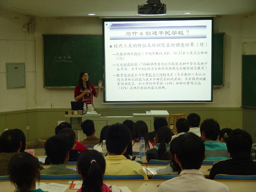 9月26日晚7:00-9:00,理教109课堂人头攒动,鼓掌声、欢呼声、讨论声此起彼伏,一阵高过一阵。这是平民学校第三期培训班必修课的第一节,由教育学院志愿者教师团队刘新芝和鲍威老师主讲的绪论课《我学习、我奉献、我分享、我快乐》正在紧张而愉快地进行。