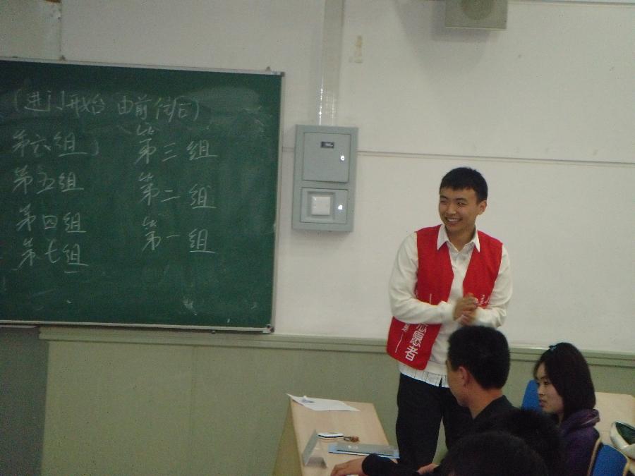 然后进入正式的教学,今天的主题是导论,目的是让同学们对英语课有一个总体而准确的把握。我们首先放了一段视频,是关于一个美国人周游四十多个国家,在不同的地方跳着同样的舞蹈,释放着同样的激情,用意在于开拓同学们的视野,让他们感受到世界各地不同的风情,告诉他们英语和舞蹈一样,可以实现无国界的沟通和交流。接下来,我们介绍了这个学期的授课内容,授课方式以及授课目标,用周星驰电影中苦练舌功的片段在欢笑中带给大家学习英语的诀窍:多说多练,而在大家有所感悟之时,我们接着进入实战,开始字母和音标环节,帮助他们坚实基础,徐磊师兄借鉴了“疯狂英语”的方法,用形象的办法帮助同学们发出了标准的元音,也激起了大家的兴趣,很多同学在课后都给予了很好的评价。最后,何天英师兄以介绍名字的意义为始,开始了组内互相熟悉和游戏的过程,即熟悉自己和组内其他成员的英文名,再将其套用在我们所给的实用句型中,大家在这个过程中都非常认真,非常愉快。