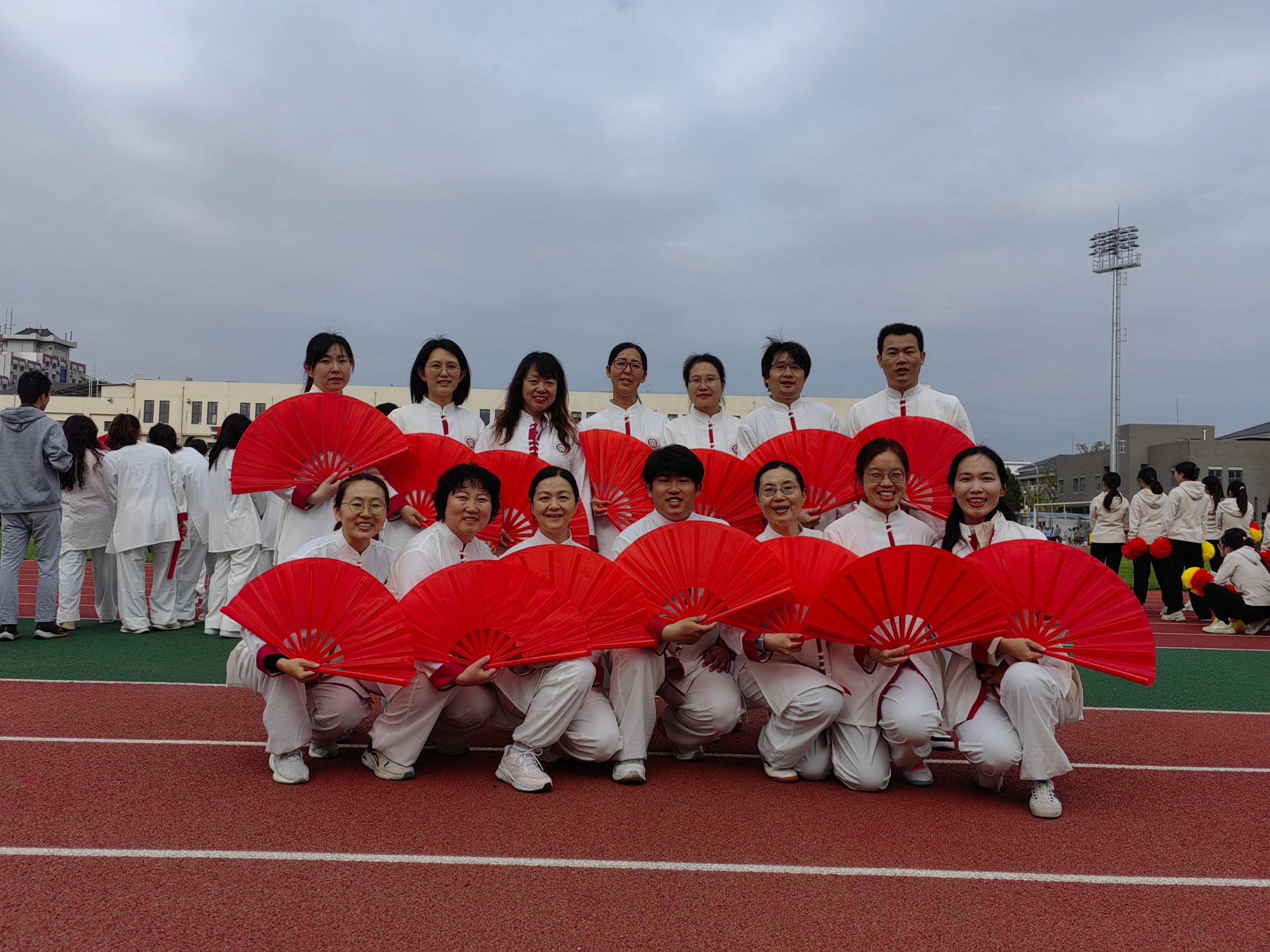 电子学院18位教师参与了开幕式大型团体扇表演,与北大师生一起,在绿色的运动场上用红色太极扇开出了一大朵艳丽的花,场面非常震撼。