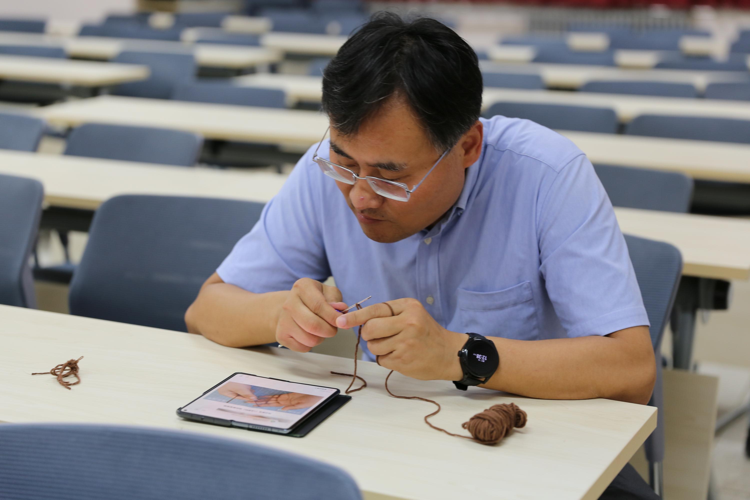 工会主席马思伟老师率先垂范,凭借其织毛衣的功底,迅速掌握钩织技巧,引领风尚;宣传委员吴双老师则展现出非凡的耐心与毅力,对视频教程的起针部分反复揣摩,终得要领,开启了她的创作之旅。其他老师们亦不甘落后,一针一线间,倾注了对教育事业的热爱与对师长的感激之情。