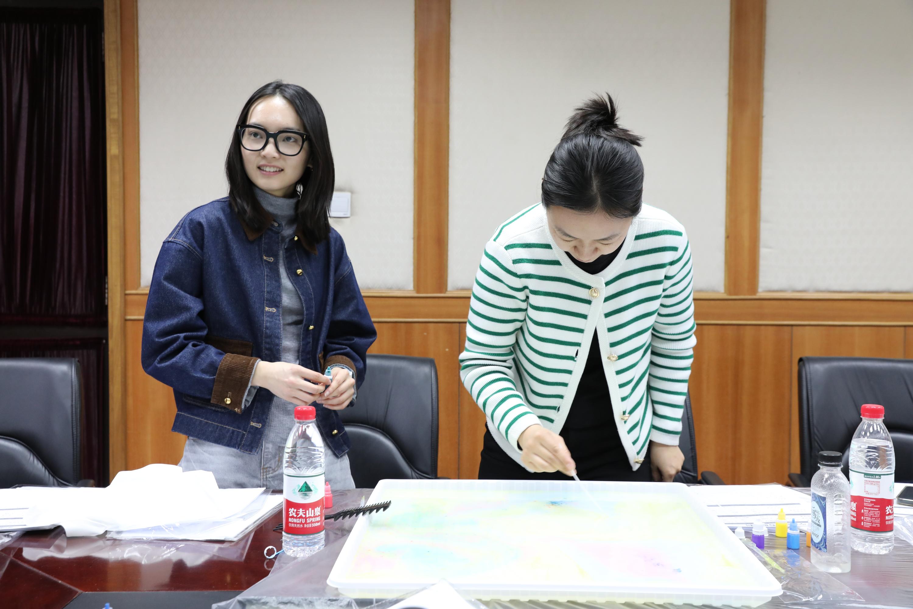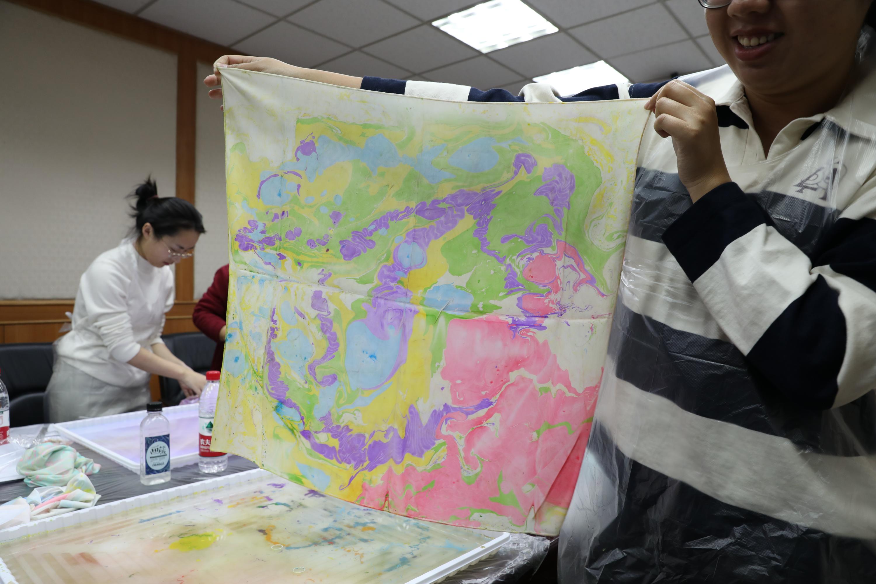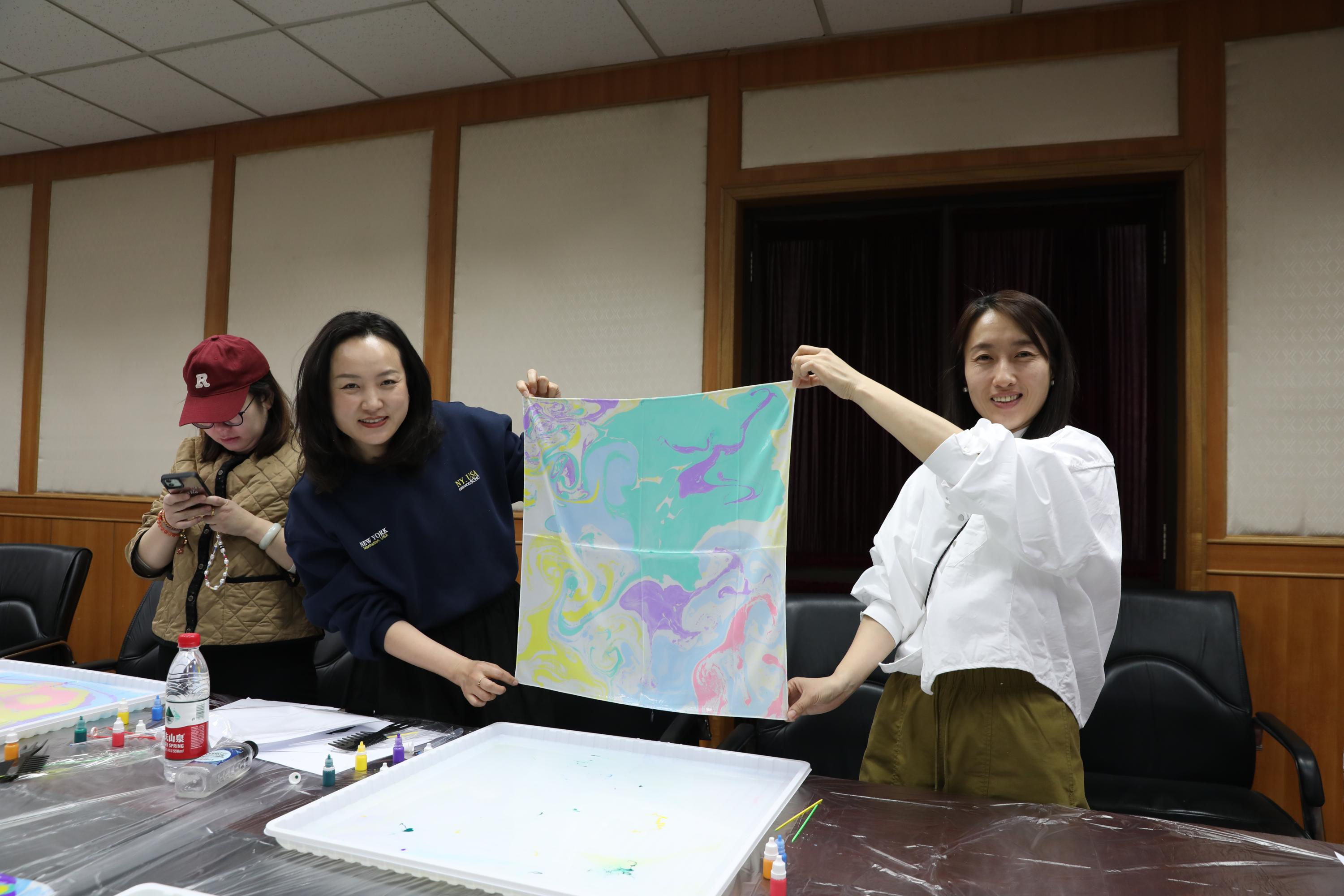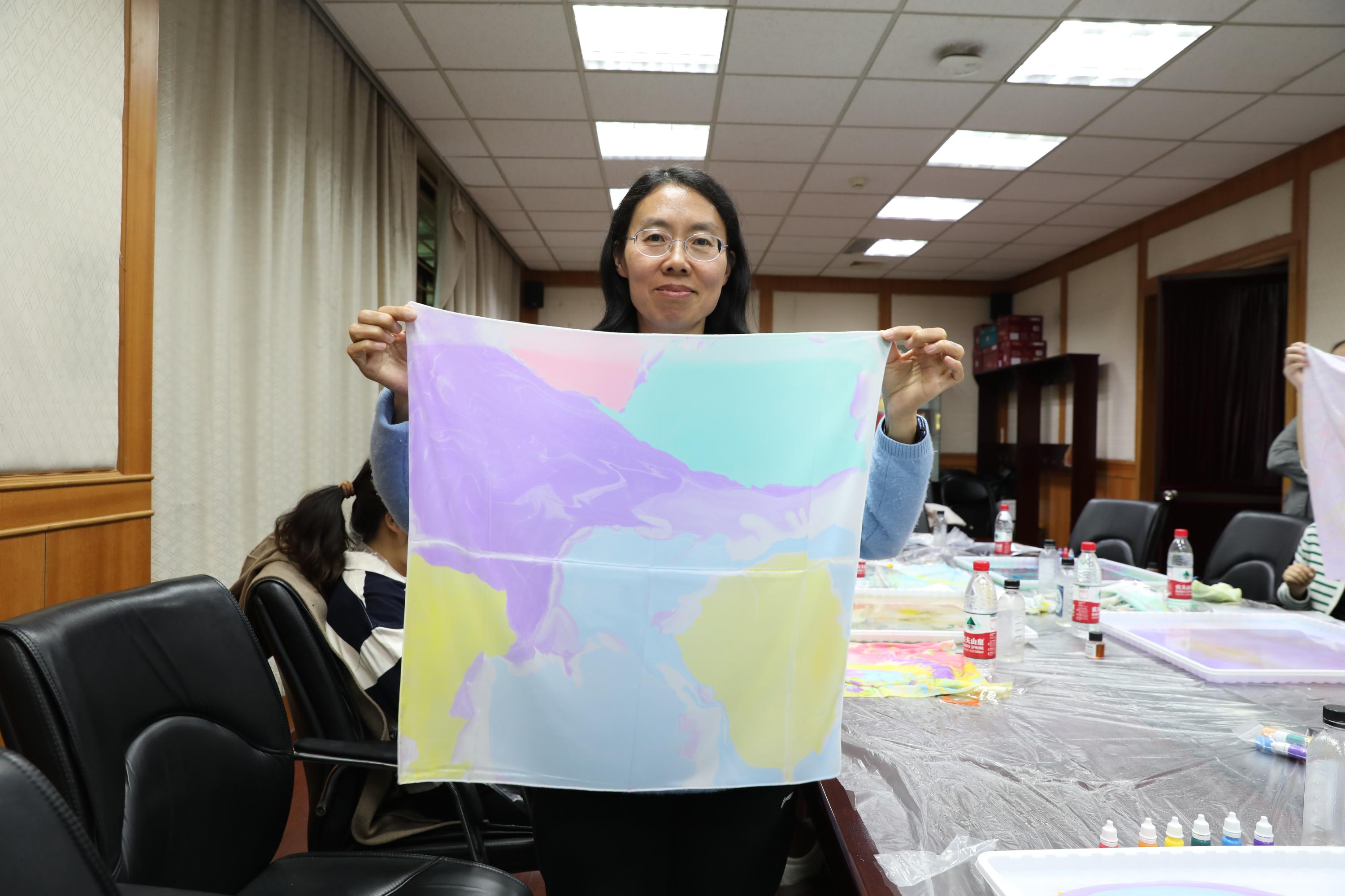 活动主持人现场讲解扎染技法。女教职工们两人一组,在扎染试剂中滴入青绿、绛紫、玫红、鹅黄等染料,用搅拌工具徐徐化开,等颜料变换出理想的图案,再合力提起丝巾四角放入试剂。随着丝巾缓缓展开,水墨般的晕染效果惊艳全场,每一幅作品都承载着创作者的巧思与期待。