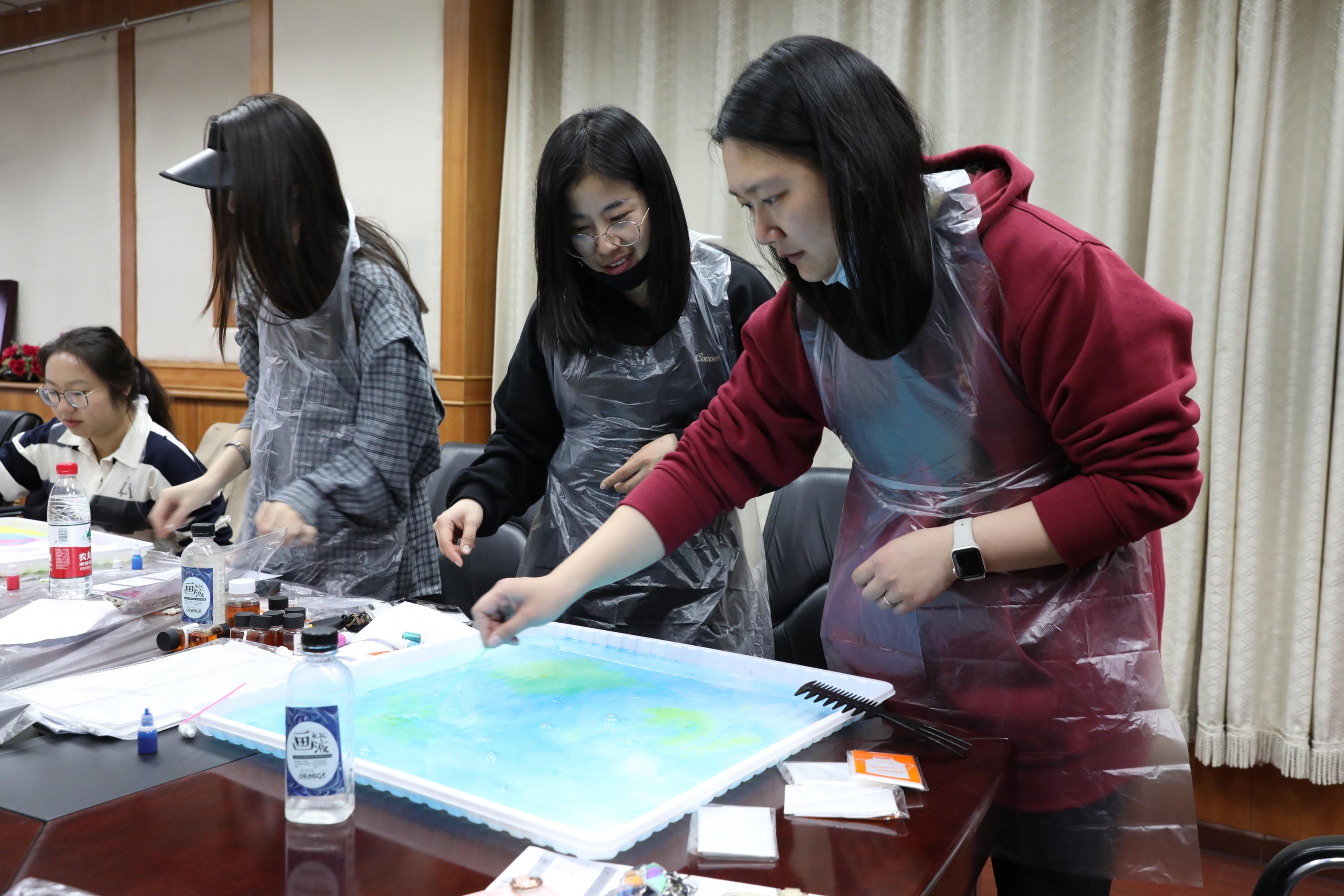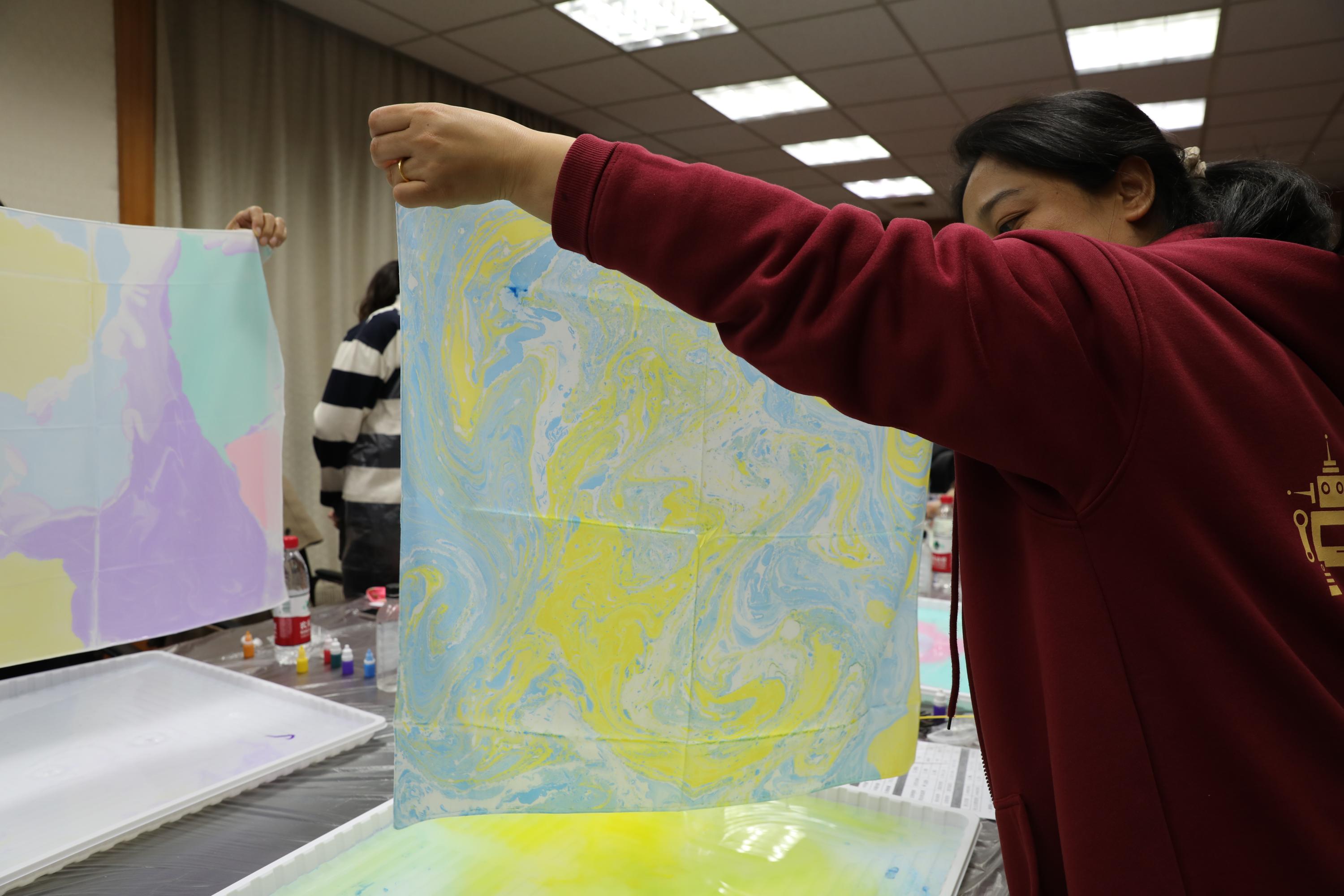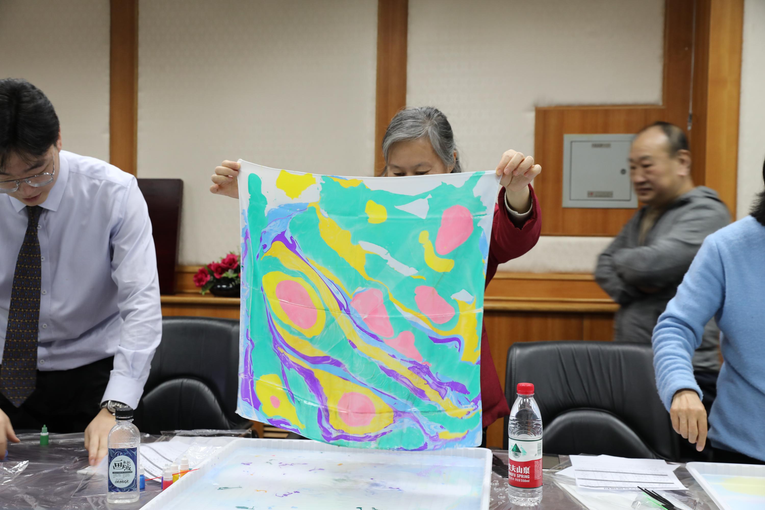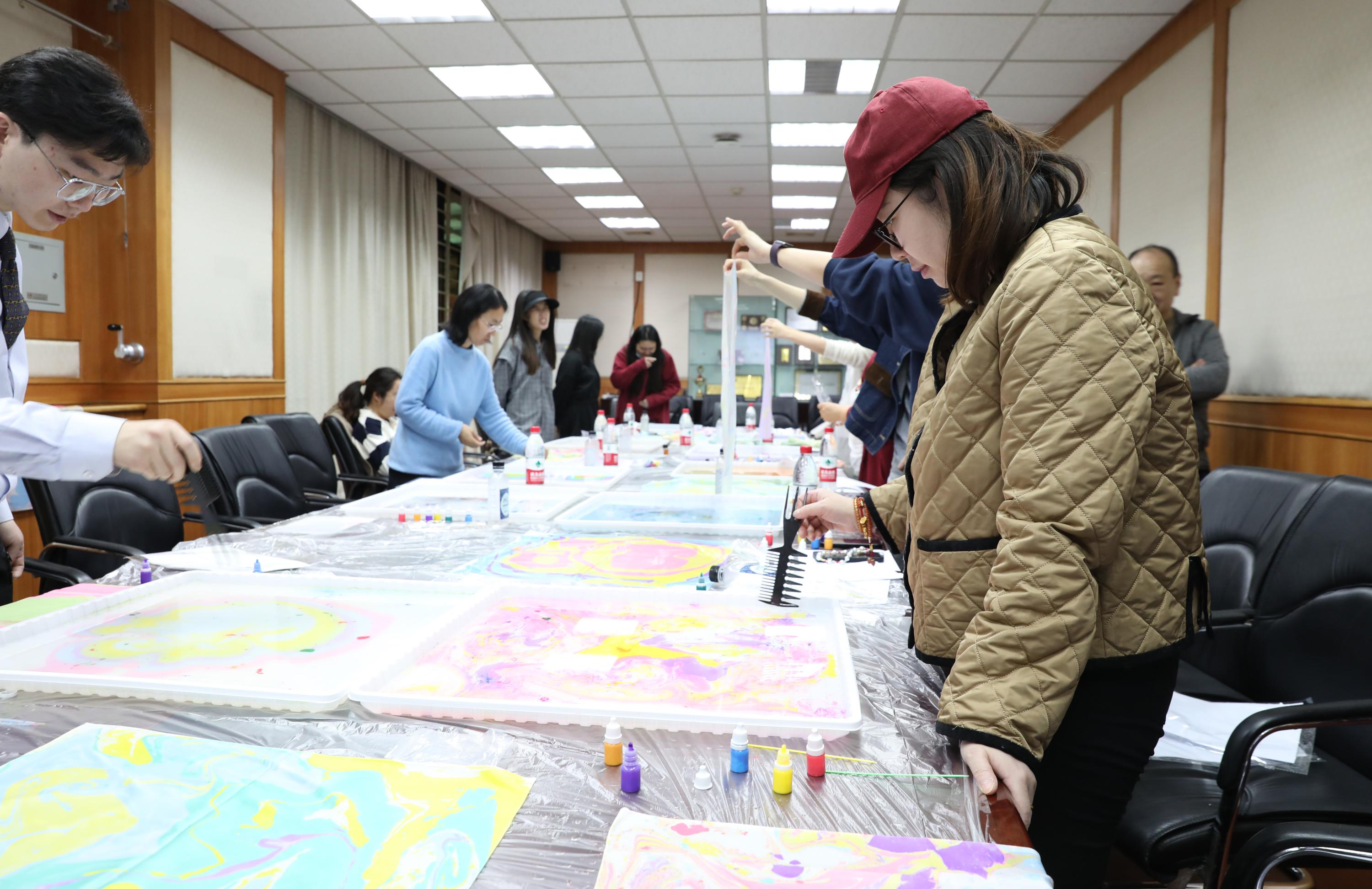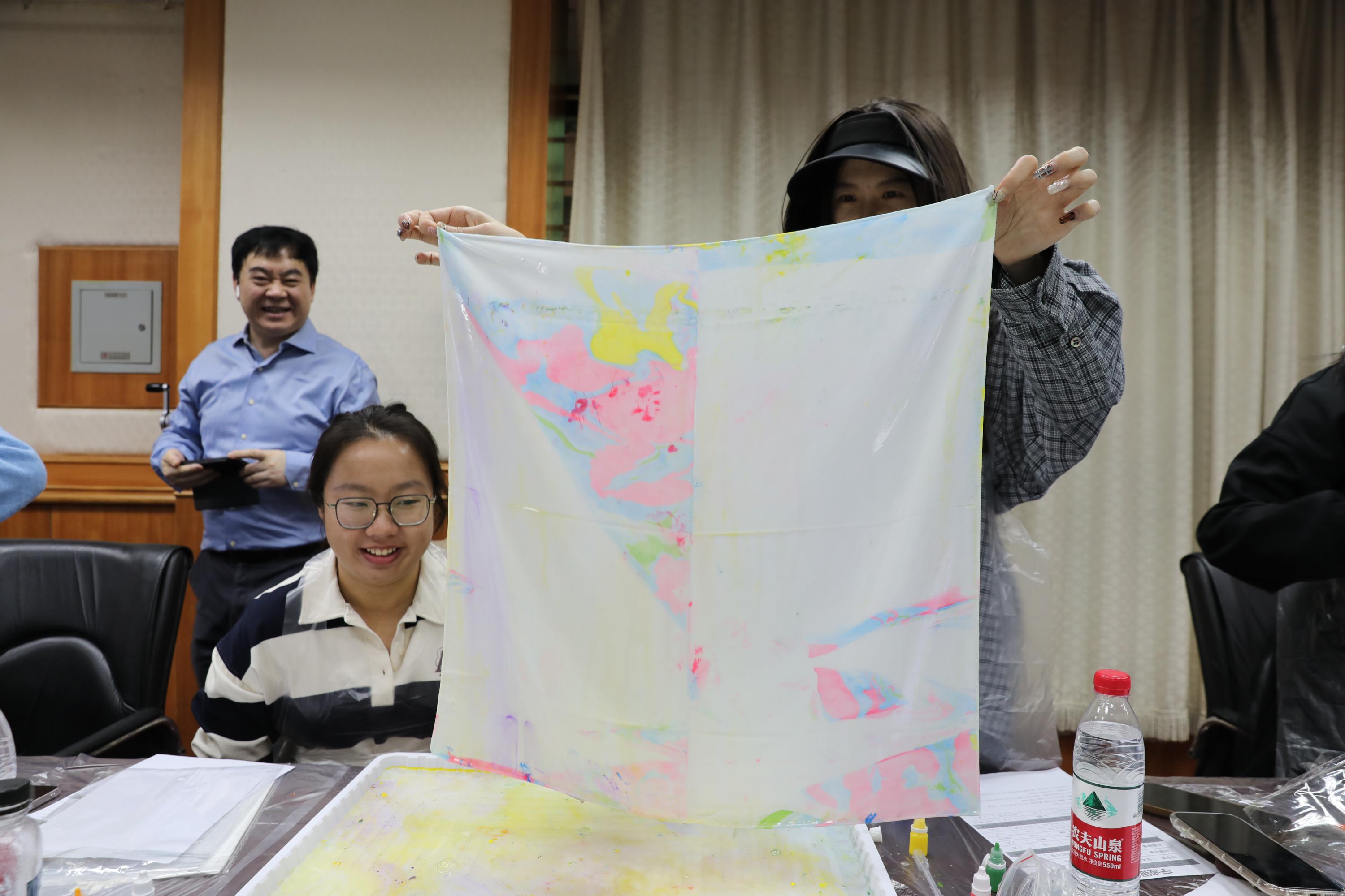 活动主持人现场讲解扎染技法。女教职工们两人一组,在扎染试剂中滴入青绿、绛紫、玫红、鹅黄等染料,用搅拌工具徐徐化开,等颜料变换出理想的图案,再合力提起丝巾四角放入试剂。随着丝巾缓缓展开,水墨般的晕染效果惊艳全场,每一幅作品都承载着创作者的巧思与期待。