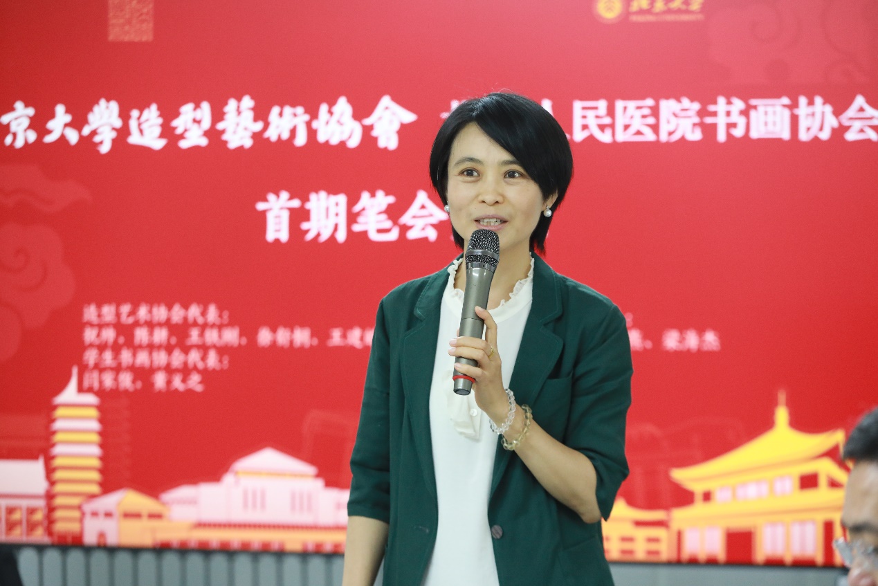 在自我介绍环节,北大人民医院书画协会会长陈军详细回忆到,会员们来自各部门科室、在共同的书画爱好号召下聚在一起,参加各种展览并多有奖项,李思萌、毛春燕、梁海杰作为今天出席交流活动的代表,笔墨各有擅长,为本次笔会雅集准备良久,十分期待今天的深入交流。