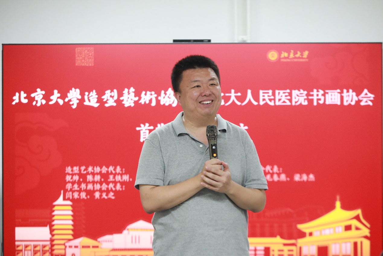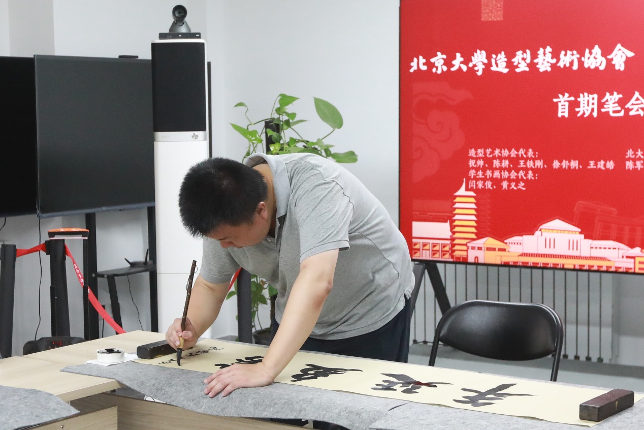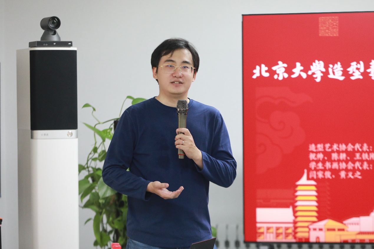 北京大学造型艺术协会会长、艺术学院研究员祝帅代表主办方致辞,他回顾了造型艺术、“书画同源”的观念历史,着重强调了造型艺术协会在成立之后积极举办的各项文化活动,特别是在上学期成功举行的首期教职工公益书法课,为校内教职工打开了专业又系统的学书门径、提供了理论与实践相结合的书学教育,为北京大学的校园文化建设做出众人合力的集体贡献。本次笔会雅集的多位同好都是公益书法课的授课教师与学员,是将北大的书法艺术与传统临习不断延续的骨干力量。